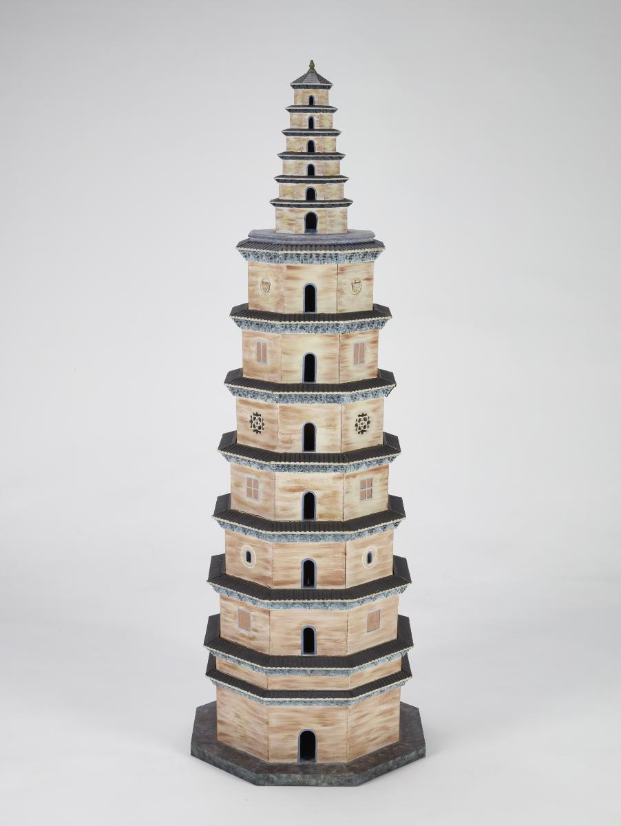 This is a model of the Dragon Glory Pagoda (Longhua ta 龙华塔), which was built in 247 A.D. and rebuilt in the Ming period in 1411 A.D. The 7-storey brick and wood pagoda is 36.6 metres tall. The model is one of a set of 84 carved after famous originals scattered throughout China, for the Chinese exhibition at the 1915 Panama-Pacific International Exposition (PPIE) in San Francisco, one of the first to represent the newly formed Republic of China. Scaled down at a ratio of 1:50, they were made by the Tushanwan 土山湾Workshop, a Christian orphanage in Shanghai that trained its residents in vocational art and crafts. The woodcarving workshop, supervised by the Bavarian-born Jesuit Aloysius Beck (1854-1931), employed both local and Western styles and techniques to produce figures of traditional Chinese gods alongside those of Catholic saints.