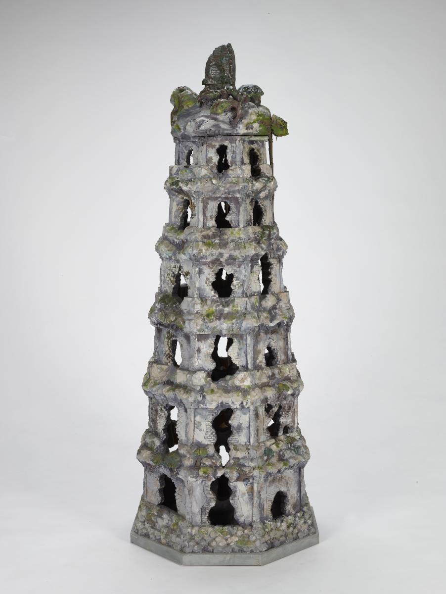 This is a model of the Struck by Lightning Pagoda (Leifeng ta雷锋塔), which was built during the Kingdom of Wuyue in 923 A.D. in Hangzhou, Zhejiang. Constructed with bricks and mortar, the 7-storey pagoda stood at 48.7 metres. The pagoda collapsed in 1924 and was rebuilt in 2002.The model is one of a set of 84 carved after famous originals scattered throughout China, for the Chinese exhibition at the 1915 Panama-Pacific International Exposition (PPIE) in San Francisco, one of the first to represent the newly formed Republic of China. Scaled down at a ratio of 1:50, they were made by the Tushanwan 土山湾Workshop, a Christian orphanage in Shanghai that trained its residents in vocational art and crafts. The woodcarving workshop, supervised by the Bavarian-born Jesuit Aloysius Beck (1854-1931), employed both local and Western styles and techniques to produce figures of traditional Chinese gods alongside those of Catholic saints.
