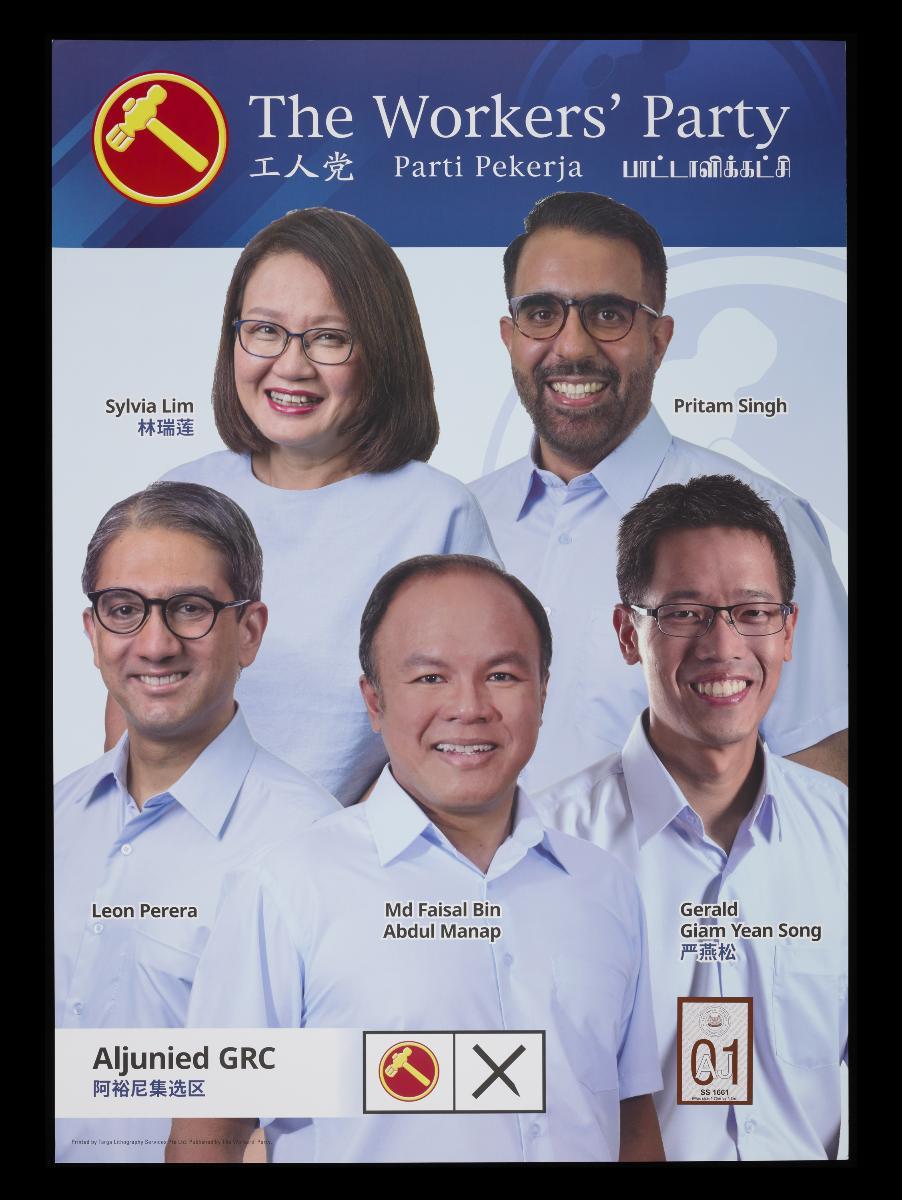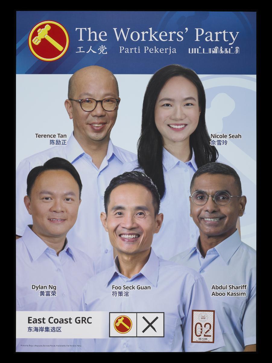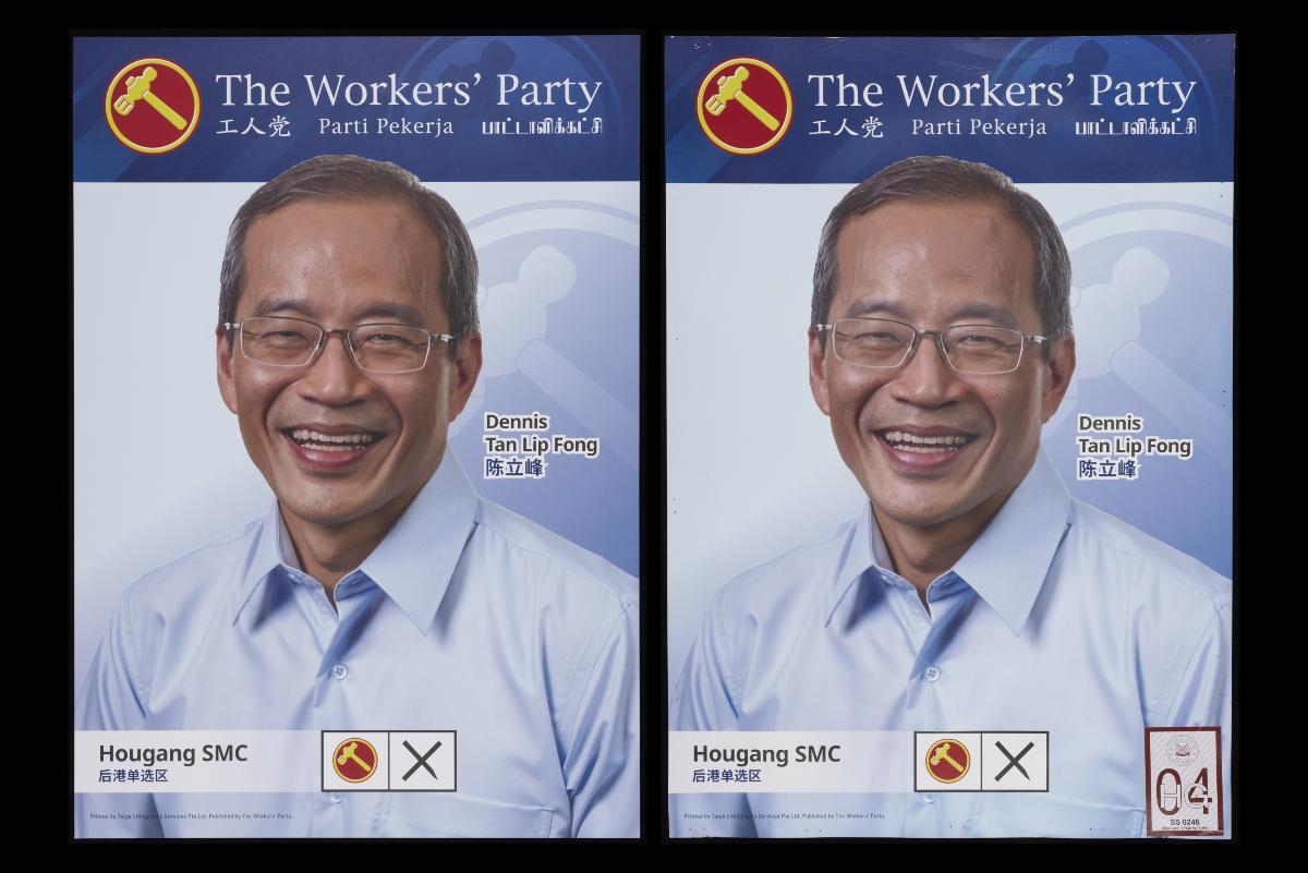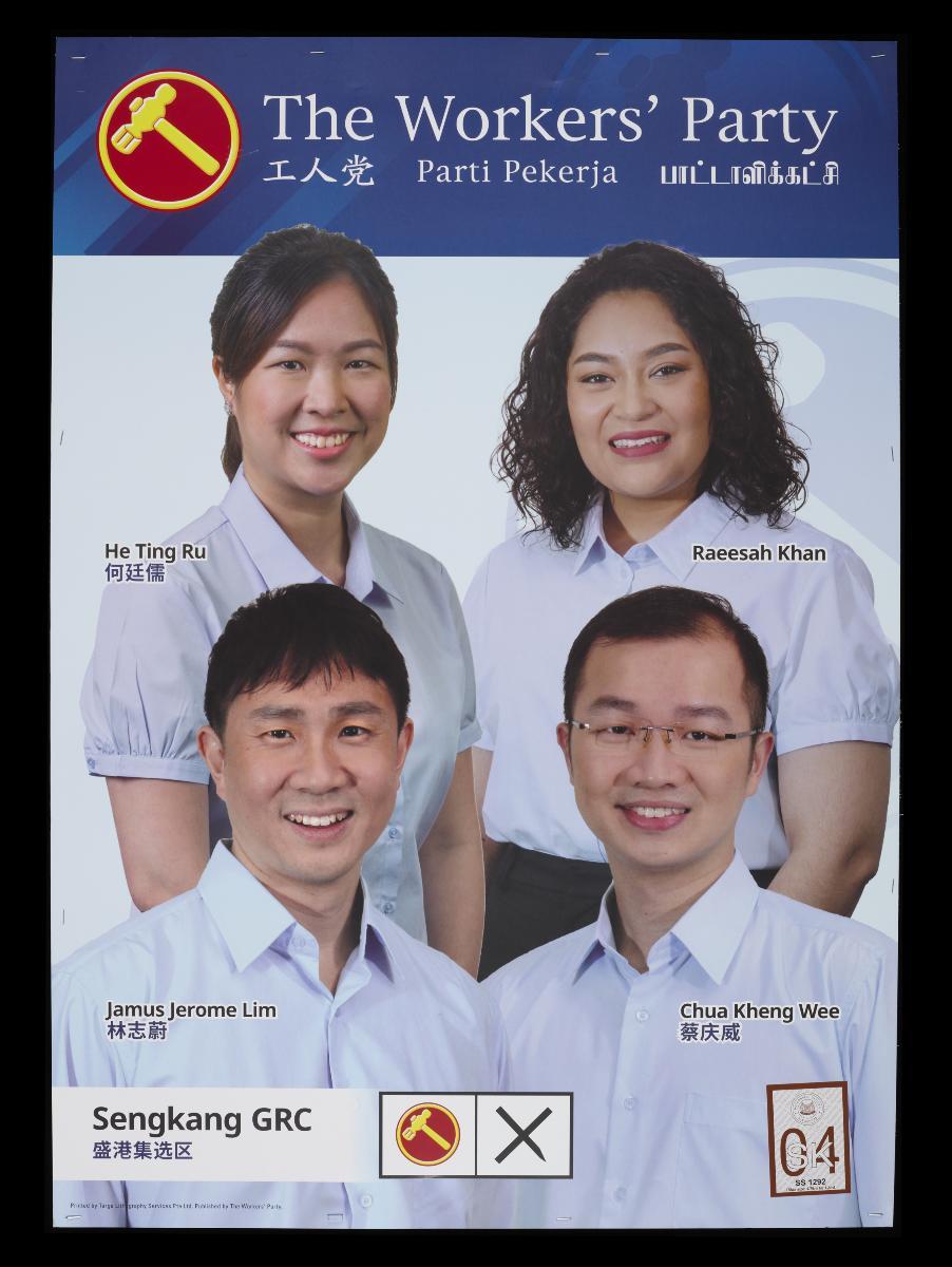 This poster shows the Workers’ Party (WP) candidate for Punggol West SMC, as well as the party’s hammer logo with a cross in front of it signifying a vote for the party. It was part of the WP campaign materials from the 2020 General Elections, or GE2020. This was Singapore’s 13th General Election, held on 10 July 2020, during the global COVID-19 pandemic. The GE2020 WP manifesto was titled “Make Your Vote Count” and stated 4 main prongs of the party’s vision for Singapore: “Achieving our dreams”, “Good jobs and dynamic workers”, “A home for all” and “A resilient democracy”. During this election, for only the second time in Singapore’s history, all seats were contested. The Workers’ Party had its best ever showing during this election, winning Aljunied and Sengkang GRCs and Hougang SMC, thus clinching 10 parliamentary seats. The remaining 83 parliamentary seats were won by the PAP. As the next best performing party, the Progress Singapore Party (PSP) took up the two available NCMP positions. After GE2020, a new formalised position of Leader of the Opposition was created in recognition of the strong public desire for diversity in Parliament, with WP Secretary-General Pritam Singh becoming the first Leader of the Opposition. The role of the Leader of the Opposition is to lead the opposition in Parliamentary business such as presenting alternative views, scrutinising the government’s positions and actions in Parliament, and nominating opposition members for appointment to Select Committees. The Leader of the Opposition is given an office in Parliament with staff support and resources, as well as the right of first response among MPs to ask the lead question of Ministers on matters in Parliament. By convention, the Leader of the Opposition typically takes the seat directly opposite the Prime Minister during Parliament sittings.
