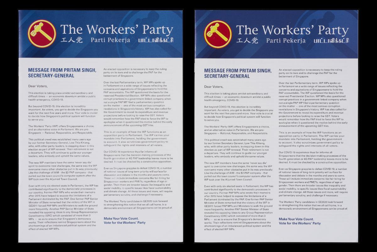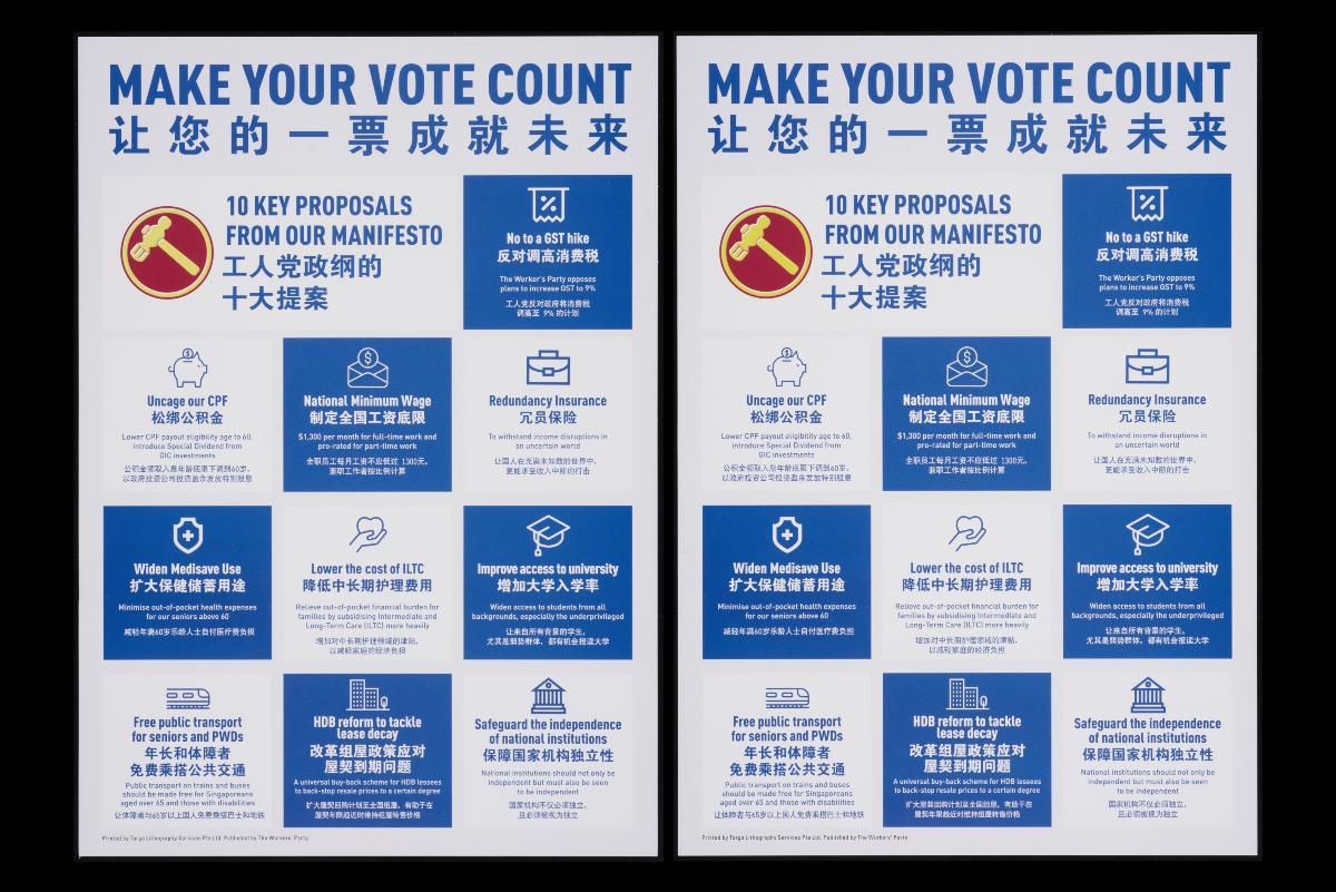 This leaflet shows the Workers’ Party candidates for Sengkang GRC as well as the party’s hammer logo with a cross in front of it signifying a vote for the party. The other side of the leaflet carries the slogan “Make your vote count” in the four official languages. The leaflet was part of the WP campaign materials from the 2020 General Elections, or GE2020. This was Singapore’s 13th General Election, held on 10 July 2020, during the global COVID-19 pandemic. The GE2020 WP manifesto was titled “Make Your Vote Count” and stated 4 main prongs of the party’s vision for Singapore: “Achieving our dreams”, “Good jobs and dynamic workers”, “A home for all” and “A resilient democracy”. During this election, for only the second time in Singapore’s history, all seats were contested. The Workers’ Party had its best ever showing during this election, winning Aljunied and Sengkang GRCs and Hougang SMC, thus clinching 10 parliamentary seats. The remaining 83 parliamentary seats were won by the PAP. As the next best performing party, the Progress Singapore Party (PSP) took up the two available NCMP positions. After GE2020, a new formalised position of Leader of the Opposition was created in recognition of the strong public desire for diversity in Parliament, with WP Secretary-General Pritam Singh becoming the first Leader of the Opposition. The role of the Leader of the Opposition is to lead the opposition in Parliamentary business such as presenting alternative views, scrutinising the government’s positions and actions in Parliament, and nominating opposition members for appointment to Select Committees. The Leader of the Opposition is given an office in Parliament with staff support and resources, as well as the right of first response among MPs to ask the lead question of Ministers on matters in Parliament. By convention, the Leader of the Opposition typically takes the seat directly opposite the Prime Minister during Parliament sittings.