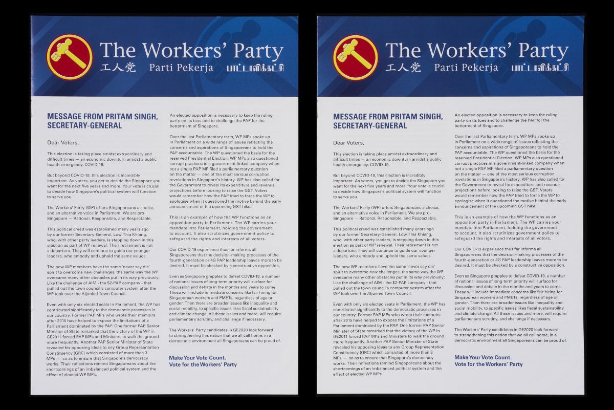 This leaflet shows the Workers’ Party candidates for Aljunied GRC as well as the party’s hammer logo with a cross in front of it signifying a vote for the party. The other side of the leaflet carries the slogan “Make your vote count” in the four official languages. The leaflet was part of the WP campaign materials from the 2020 General Elections, or GE2020. This was Singapore’s 13th General Election, held on 10 July 2020, during the global COVID-19 pandemic. The GE2020 WP manifesto was titled “Make Your Vote Count” and stated 4 main prongs of the party’s vision for Singapore: “Achieving our dreams”, “Good jobs and dynamic workers”, “A home for all” and “A resilient democracy”. During this election, for only the second time in Singapore’s history, all seats were contested. The Workers’ Party had its best ever showing during this election, winning Aljunied and Sengkang GRCs and Hougang SMC, thus clinching 10 parliamentary seats. The remaining 83 parliamentary seats were won by the PAP. As the next best performing party, the Progress Singapore Party (PSP) took up the two available NCMP positions. After GE2020, a new formalised position of Leader of the Opposition was created in recognition of the strong public desire for diversity in Parliament, with WP Secretary-General Pritam Singh becoming the first Leader of the Opposition. The role of the Leader of the Opposition is to lead the opposition in Parliamentary business such as presenting alternative views, scrutinising the government’s positions and actions in Parliament, and nominating opposition members for appointment to Select Committees. The Leader of the Opposition is given an office in Parliament with staff support and resources, as well as the right of first response among MPs to ask the lead question of Ministers on matters in Parliament. By convention, the Leader of the Opposition typically takes the seat directly opposite the Prime Minister during Parliament sittings.
