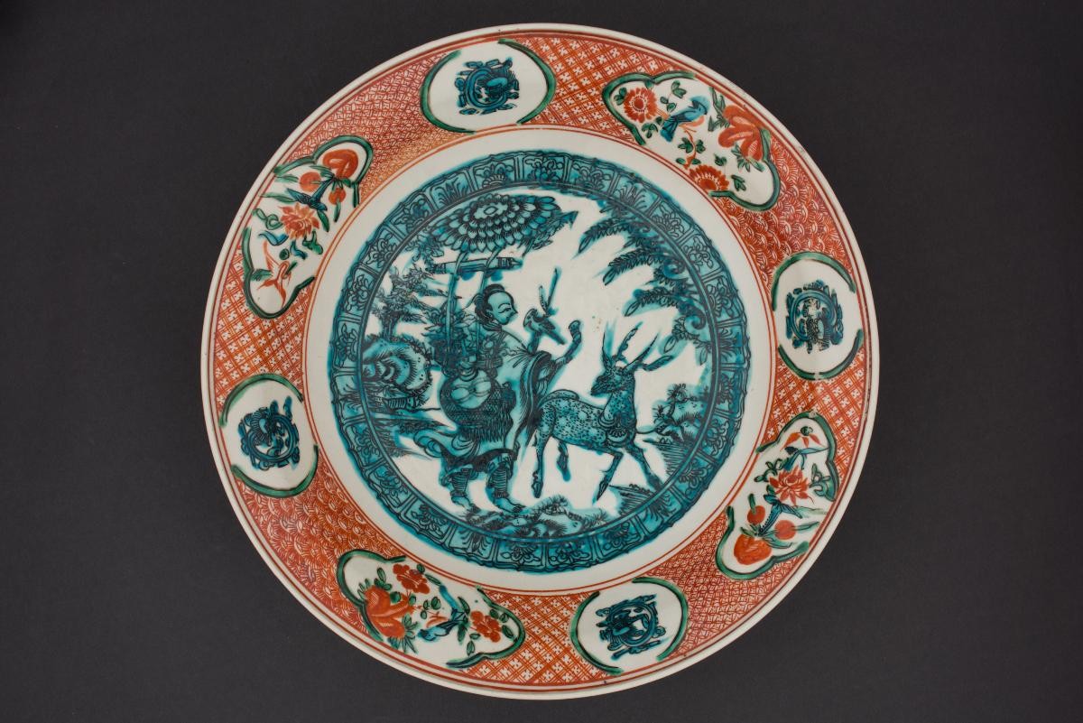 This embroidered panel was presented to the family matriarch Mdm Chan Swee Ngor (1889–1978) by her nephews and grandsons in celebration of her 71st birthday (as indicated by the inscription “八秩开一” on the banner). The central figure is Magu 麻姑, the Daoist immortal who represents longevity. According to legend, Magu brewed a fine wine from lingzhi fungus to present to the Queen Mother of the West at her birthday banquet. Flanking Magu are the Eight Immortals, an eclectic group of individuals in Chinese mythology who had achieved immortality through personal cultivation and effort.