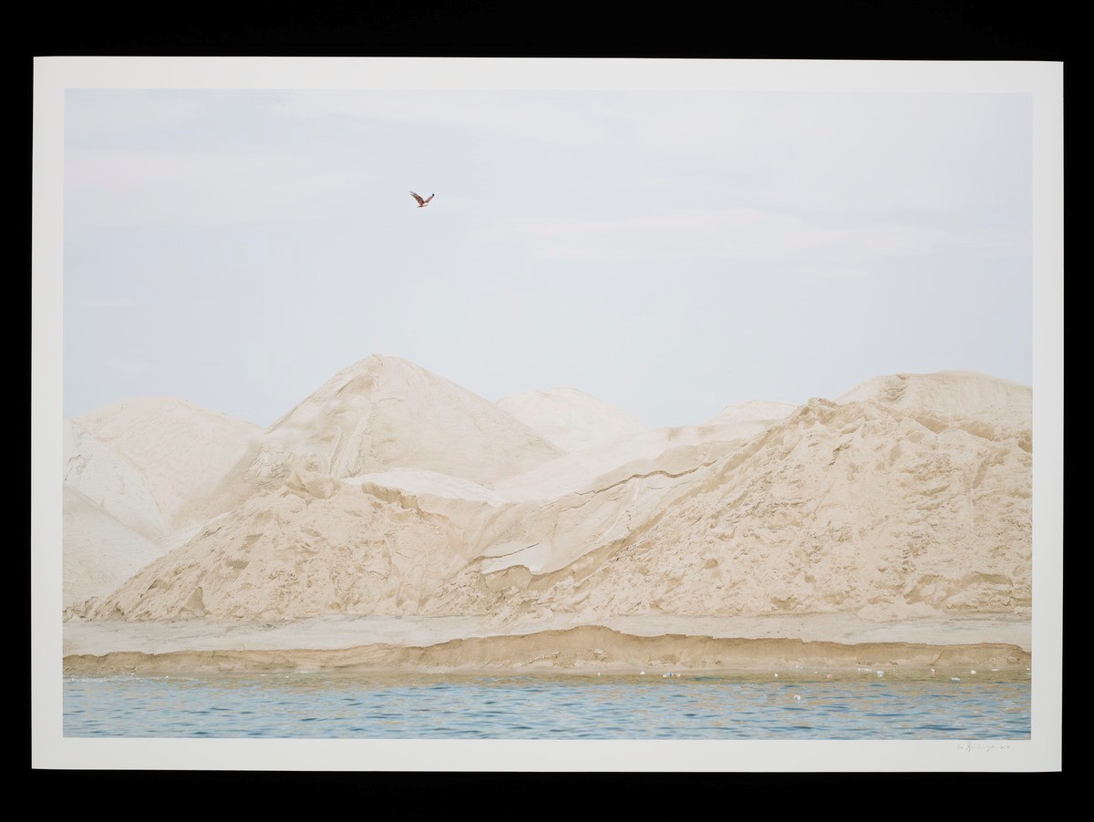 Construction material – possible “manufactured sand” which is crushed granite – comes in on a barge into Singapore’s east coast, going past its Changi Airport, where an aeroplane had just taken off from Singapore. As a land-strapped coastal city, Singapore tries for solutions to expand its useable land area as its population increases. This photograph is from Singaporean photographer Sim Chi Yin’s Shifting Sands series, which documents the role sand plays in land reclamation and the impact it has on the social, environmental and political landscapes in Singapore and the region today.