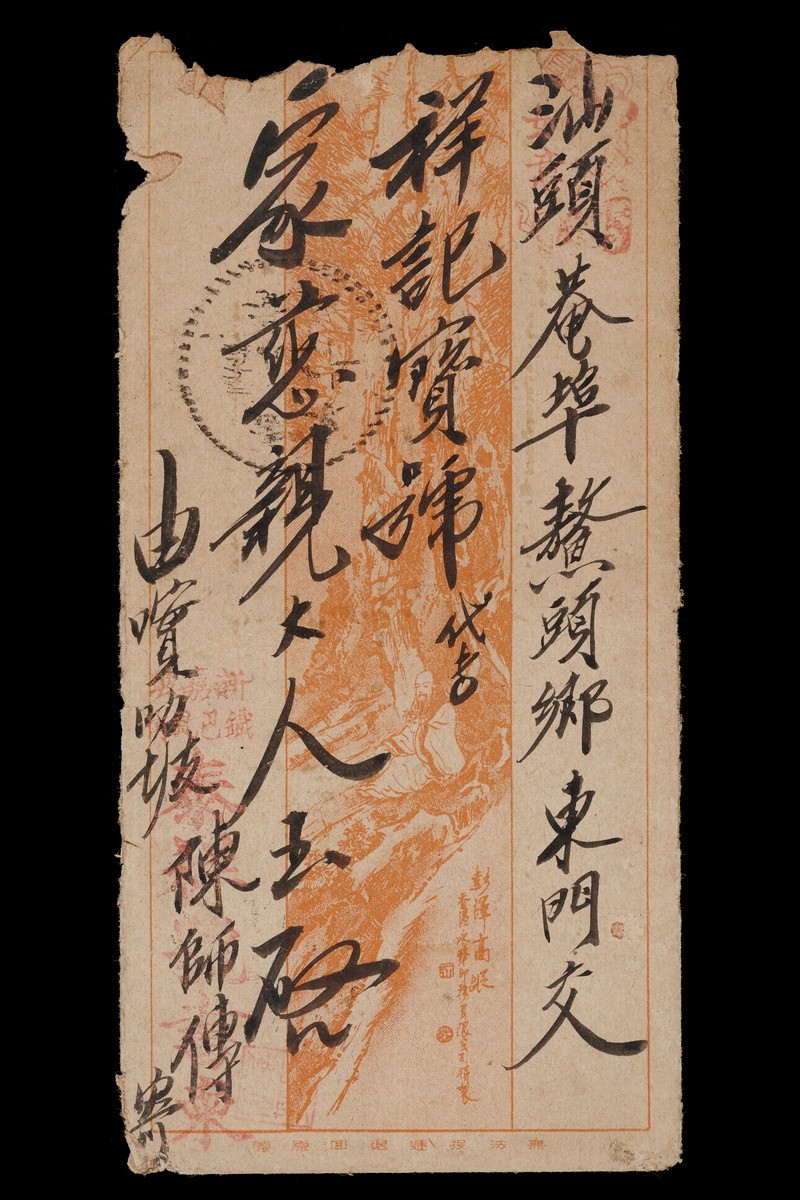 This is an empty Chinese remittance envelope dated to 1933, delivered from Singapore. It was delivered through qiaopi (侨批), a private mail delivery system established by early Chinese immigrants in the early 19th century to deliver money and family letters to their home villages in China. This envelope was stamped with Ampow and Penang chops. This indicated that the letter had passed through Penang and Ampow before reaching its destination at Swatow, China.