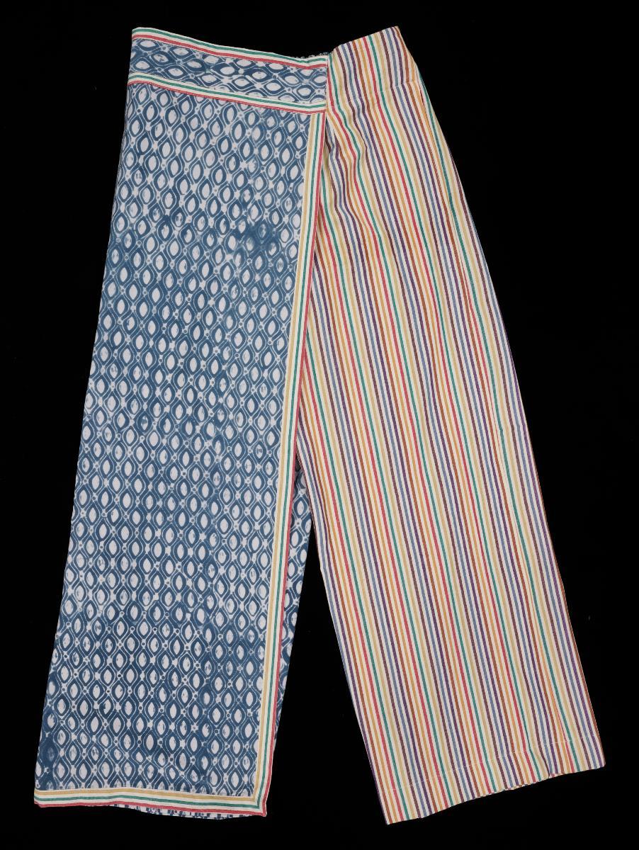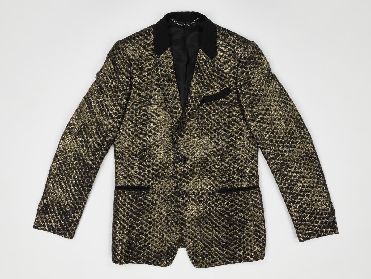 This jacket and its matching pair of trousers were featured in the DSquared2 Spring Summer 2014 runway show. The show opened with the sound of a plane crash, and the rest of the show took place in a setting designed to evoke a jungle. The ensemble is made with a bamboo weave fabric. The use of bamboo weave in an open weave pattern echoes the woven patterns of cane and rattan used in furniture and homeware.