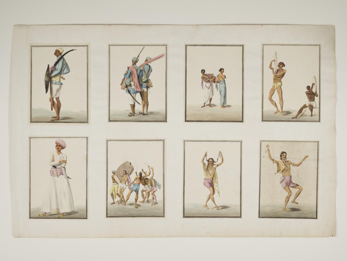 ML1256 Eight individual studies in small dark grey frames pasted onto an album page - from the Louisa Parlby Album Murshidabad, India1795-1803 Watercolour on paper Album page 50 × 76.2 cmFrom top left to right:A snake charmerB annoyed African servantC urddhvabahu ascetic with one upraised hand D man dancing with two swords with interesting turban and cummerbundE same man and another with swordsF standing tabla playerG dancers at the Charak Puja festival H female dancerThis set of eight individual character studies to be seen in Bengal in the late 18th to early 19th century, including ascetics, musicians and others likely to be seen at festivals such as the Charak Puja (hook-swinging festival), were of interest to foreigners then living in Bengal. The Parlby album from which this sheet originates, contained various sets of architectural, topographical, festival and individual studies painted by Bengal artists from 1795–1803.In the context of Singapore, the sepoys were among the first Indians to arrive in Singapore. In January 1819, 120 sepoys landed in Singapore, together with Sir Stamford Raffles and Farquhar. They belonged to the Bengal Native Infantry and were accompanied by a bazaar contingent comprising of washermen, tea-makers, milkmen and domestic servants. This set of individual studies captures in realistic manner the life and operations of Bengalis in Murshidabad; providing apt socio-historical milieu about Bengalis who later arrived in Singapore.