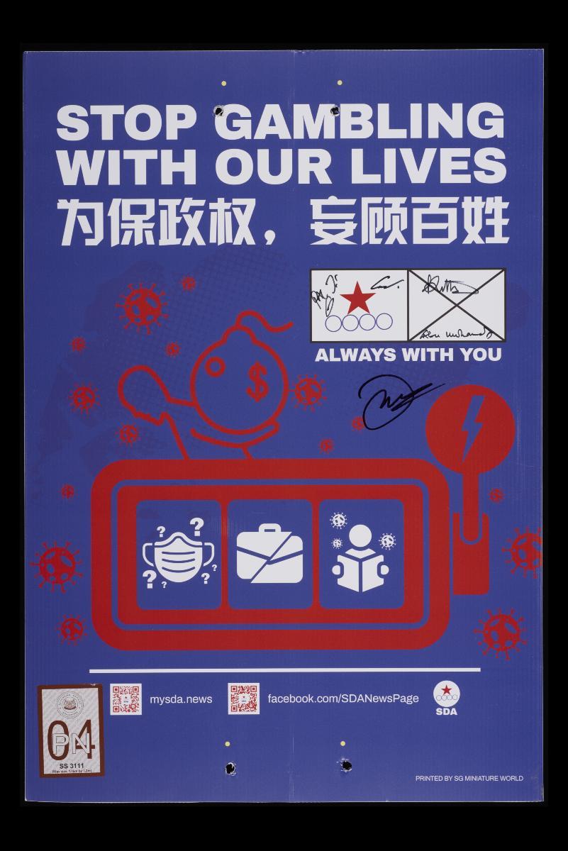 This and similar autographed posters were sold by the Singapore Democratic Alliance (SDA) after their campaigning at Pasir Ris-Punggol GRC during the 2020 General Elections, or GE2020. The funds raised from poster sales were donated to the Straits Times School Pocket Money Fund. GE2020 was Singapore’s 13th General Election, held during the global COVID-19 pandemic on 10 July 2020. For only the second time in Singapore’s history, this election saw all seats being contested. The SDA contested Pasir Ris-Punggol GRC in a 3-way fight with the People’s Action Party (PAP) and People’s Voice (PV). The SDA is Singapore’s only coalition of political parties, registered on 28 June 2001. During GE2020, the alliance comprised of the Singapore Justice Party (SJP) and Singapore Malay National Organisation (PKMS).