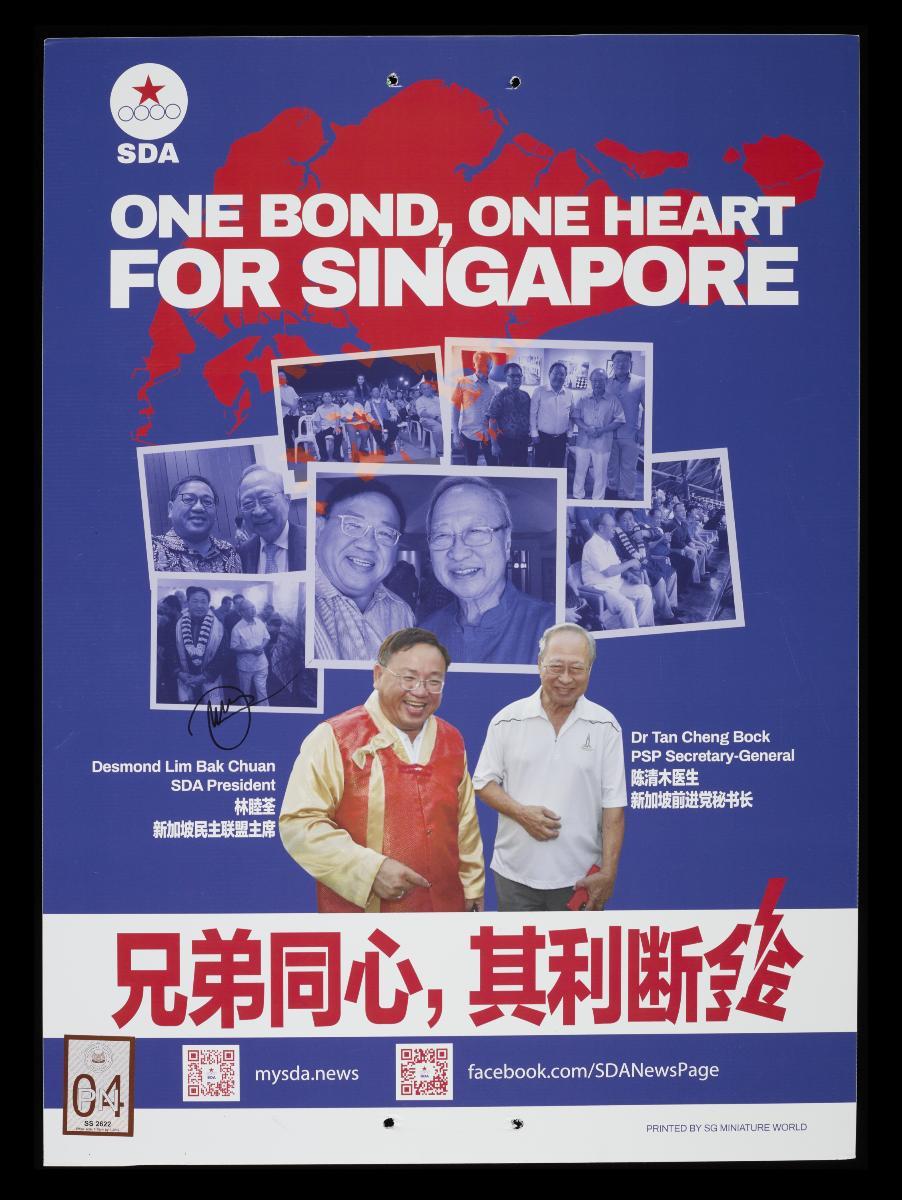 This and similar autographed posters were sold by the Singapore Democratic Alliance (SDA) after their campaigning at Pasir Ris-Punggol GRC during the 2020 General Elections, or GE2020. The funds raised from poster sales were donated to the Straits Times School Pocket Money Fund. GE2020 was Singapore’s 13th General Election, held during the global COVID-19 pandemic on 10 July 2020. For only the second time in Singapore’s history, this election saw all seats being contested. The SDA contested Pasir Ris-Punggol GRC in a 3-way fight with the People’s Action Party (PAP) and People’s Voice (PV). The SDA is Singapore’s only coalition of political parties, registered on 28 June 2001. During GE2020, the alliance comprised of the Singapore Justice Party (SJP) and Singapore Malay National Organisation (PKMS).