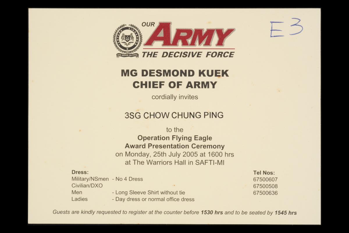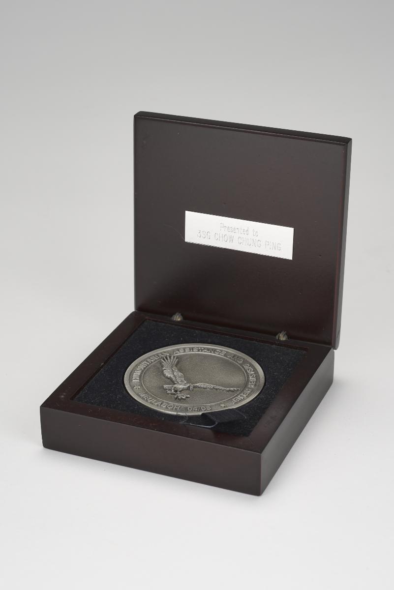 On 26 December 2004, a magnitude 9.0 earthquake occurred off the coast of Sumatra, triggering several tsunamis which killed at least at least 225,000 people across several countries. As part of the Singapore Armed Forces' largest-ever humanitarian relief effort, SAF personnel were deployed to affected areas in Indonesia and Thailand. The SAF Tsunami Relief Operation 2004 Medal was awarded to personnel involved in tsunami relief operations between 26th December 2004 and 25th February 2005. This particular medal was awarded to 3SG Chow Chung Ping of 35th Battalion, Singapore Combat Engineers.
