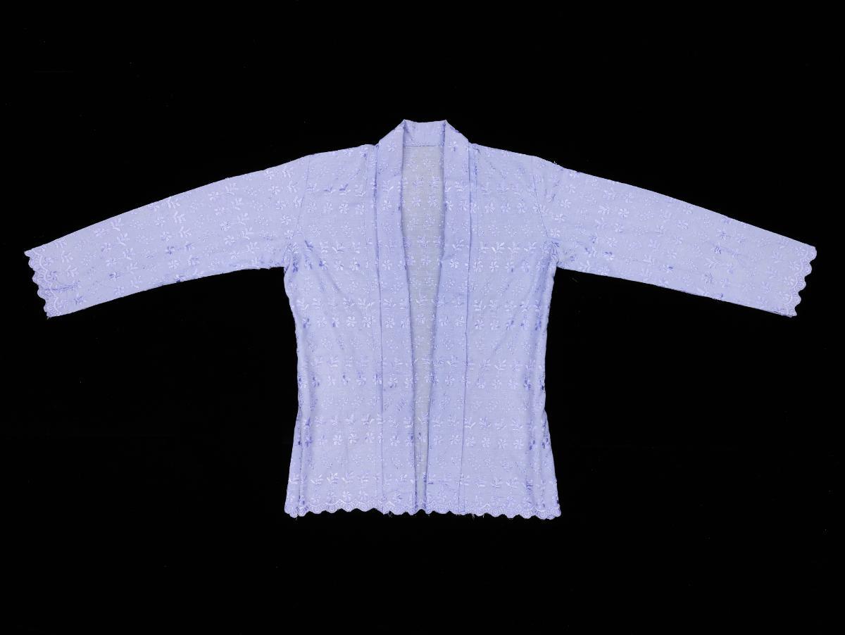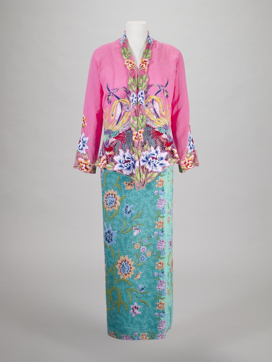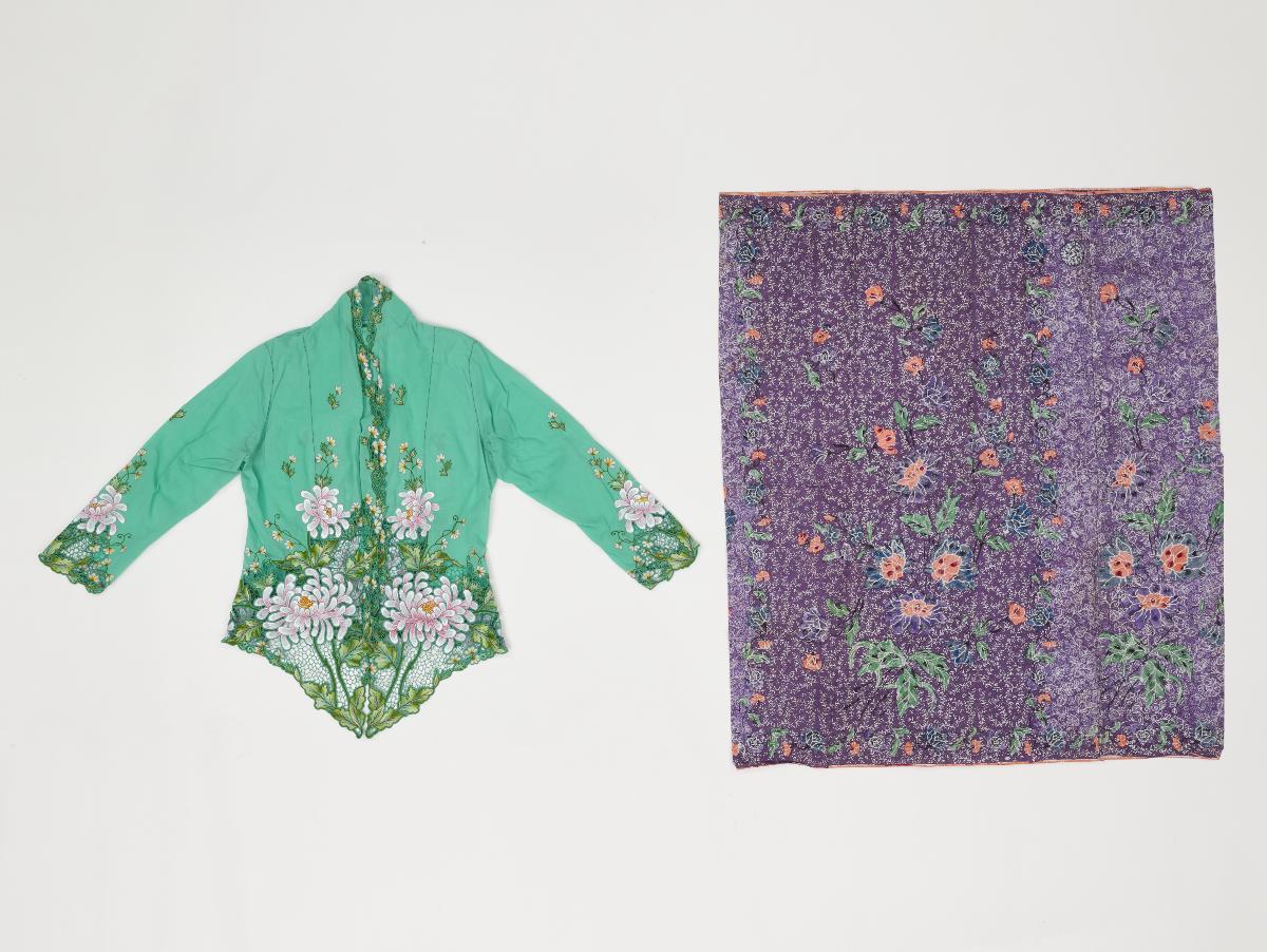 Indonesian couturier Didi Budiardjo pays homage to style icon Madame Wellington Koo (1889–1992) by imagining what she would wear in the 21st century given her Peranakan lineage. He explores the continuity of fashion heritage with a kebaya trimmed with English and French lace that recalls the technique, silhouette, and colour of a prevalent 1920s kebaya style in Java, Singapore, and Malaya. Using a 1930s finely hand drawn Pekalongan fabric, he challenges the traditional straight sarong silhouette by creating an A-line skirt, with the rectangular front panel (kepala) arranged at the back. This sarong kebaya was part of an exhibition in Jakarta titled “Tiga Negeri” which reflects on Peranakan culture.An international socialite, daughter of prominent tycoon Oei Tiong Ham, and briefly the First Lady of the Republic of China (late 1926–1927), Madame Koo was featured several times in Vogue magazine and is remembered for her adaptations of Chinese dress. Didi Budiardjo is one of Indonesia’s most respected designers today, known for elegant, modern evening gowns and kebaya, and a deep respect for Indonesia’s strong textile heritage. He launched his practice in 1989 and studied at Atelier Fleuri Delaporte in Paris.