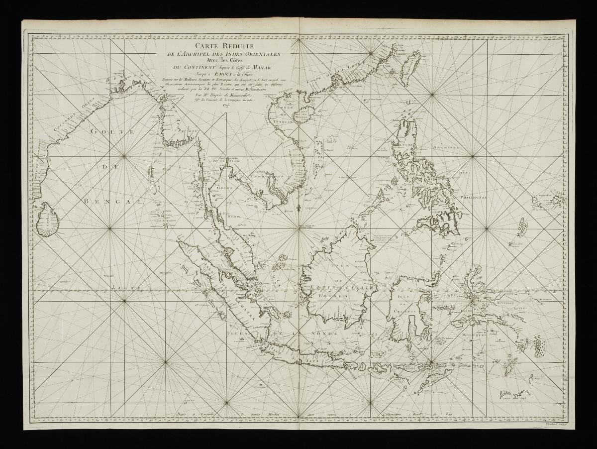 This chart of the the Straits of Banca and Malacca was produced by the French hydrographer Jean-Baptiste Nicolas Denis d'Après de Mannevillette as one of 22 charts compiled for the atlas Le Neptune Oriental, published in 1745. This sea chart atlas was commissioned by the French East India Company, with support from the French Academy of Sciences. Singapore is indicated on this chart as “I. Panjang”, referencing its common Malay name at that time, Pulau Panjang. The Old and New Straits of Singapore are also marked along the north and south coasts of the island.