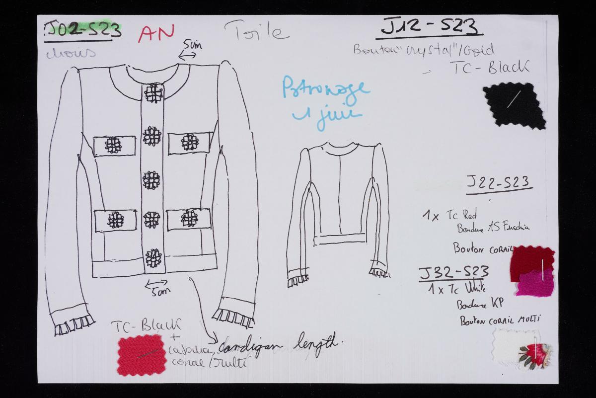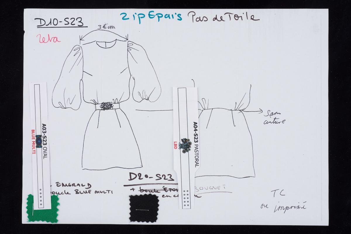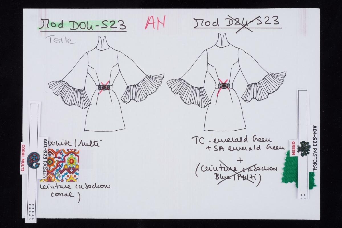 Sketches with fabric swatches from Andrew Gn Spring/Summer 2023 collection