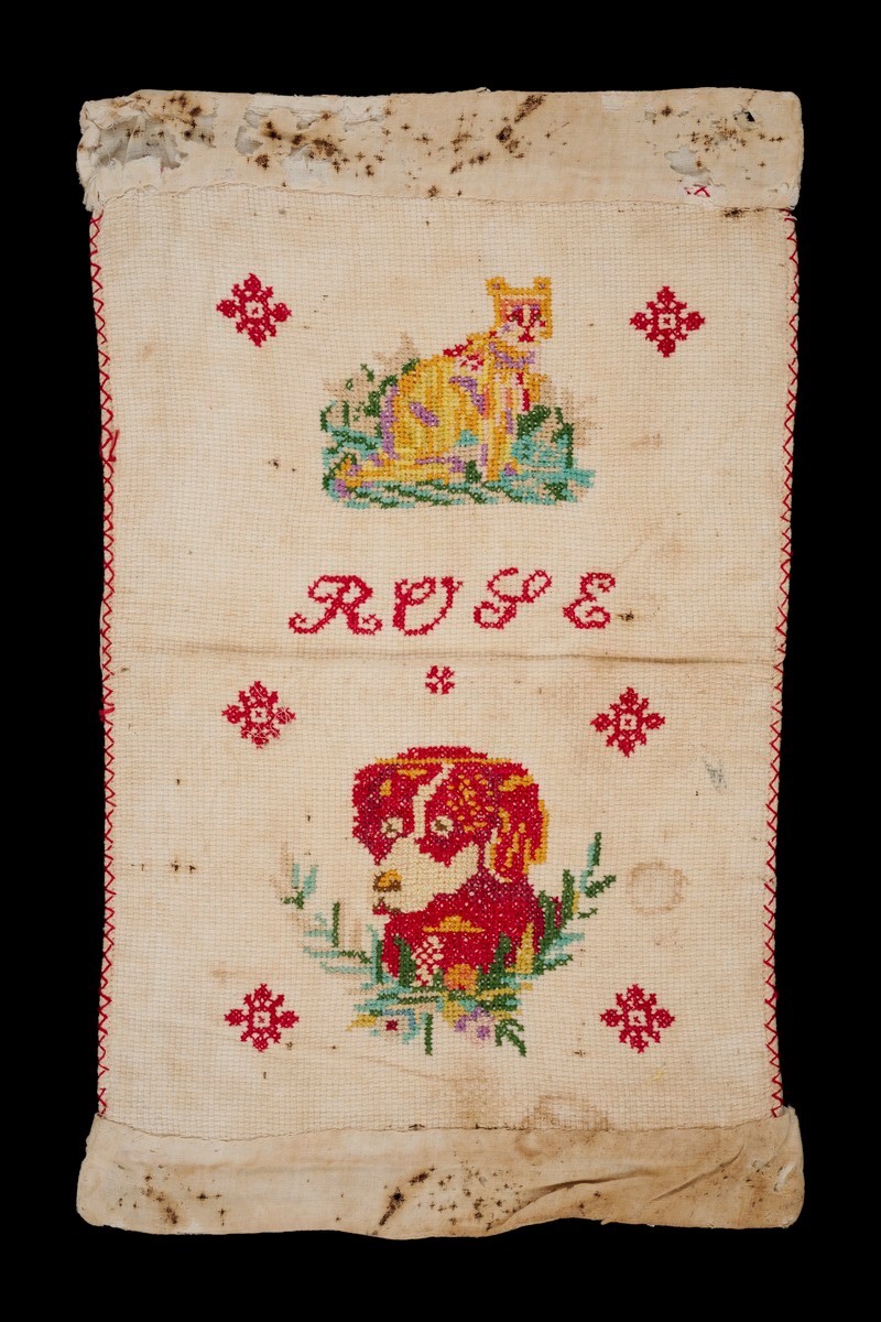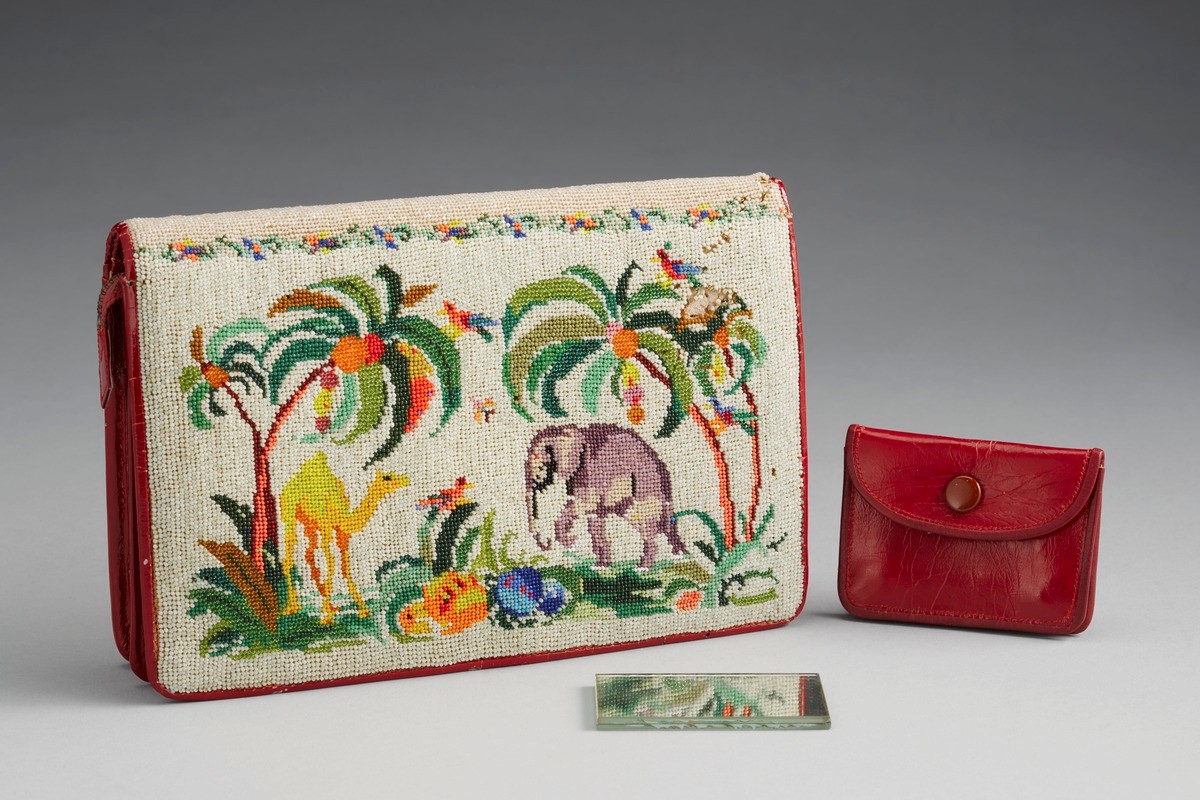 Alice Choo (1926-2019) beaded this panel, probably with the intention to make it into a clutch purse. She depicted a green bird with a red breast and long trailing tail feathers in one composition, and a tiger surrounded by tall grass in another. The tiger was among one of her favoured motifs as it was her Chinese zodiac sign. They were worked in glass seed beads in petit-point stitch. Also known as tent stitch or half-cross stitch, this technique involved sewing each bead diagonally over intersections of the needlepoint canvas’s warp and weft threads. Like most nyonyas, Choo was taught to bead and embroider at home.
