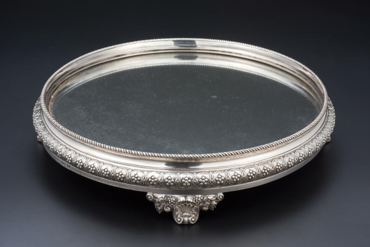 The silver epergne with the mark of Henry Mathews, a maker from Birmingham, England, belonged to a Peranakan family in Singapore. Its form, with one fixed and three detachable trumpets, is similar to the glass epergnes that were also used in Peranakan households to hold items such as bunga rampai (flower potpourri).Items such as these illustrate the increasingly Westernised lifestyles of the Chinese Peranakan community during the 20th century and would have complemented other tabletop items of European origin, such as English transferware dinner services.