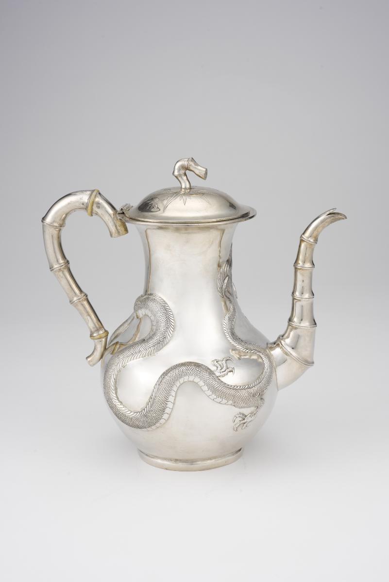 This silver bowl made by Tuck Chang, Shanghai, is decorated with a winding dragon motif in repousse. It belonged to a Peranakan family in Singapore. An example of Chinese export silver for the European market, items such as these were also popular with Peranakans, who were known to have in their households items of Chinese export silver such as teapots, coffee pots and decorative bowls, illustrating both the Chinese and Western influences on their lifestyles.