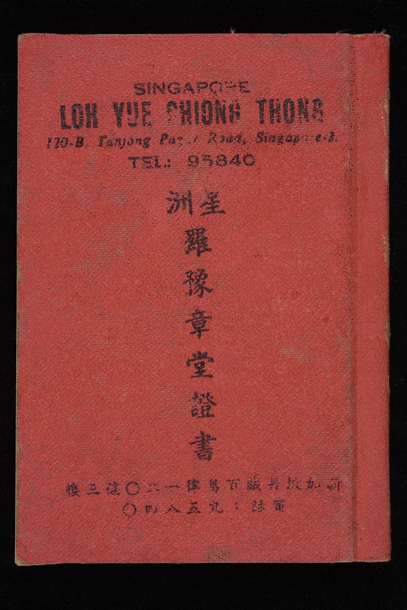 This is a membership booklet belonging to a member of the Poon Yue Association (Pan Yu hui guan 番禺会馆). The Poon Yue Association was founded in 1879 at Upper Cross Street by Hoo Ah Kay (1816 - 1880), a well-known community leader from the Whampoa district in Guangdong province. The booklet contained the personal information of the member it belonged to, which would include their name, age, sex, as well as the person who introduced them into the organisation. The booklet also contained the association's charter that dictated its rules and regulations, written in both English and Chinese.