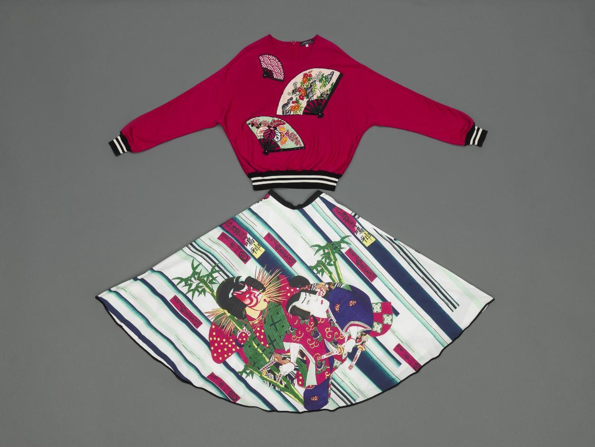 This Basile ensemble belonged to Judith Chung, a fashion entrepreneur and journalist. The sequined black vest comes with an attached dickey (tuxedo front) and red satin bowtie. It is paired with a black double-tiered gathered skirt. With its roots in Italian tailoring, Basile in the 1970s–80s was a top Italian label that also distributed to Japan and Singapore.Judith Chung was the owner of the popular boutique Man and His Woman (1972–1993), one of the most significant shops in Orchard Road. The multi-label store brought in the most desirable global high fashion labels in the 1970s–80s. Her tastes and shop shaped an entire generation of fashionable people in Singapore and the region.