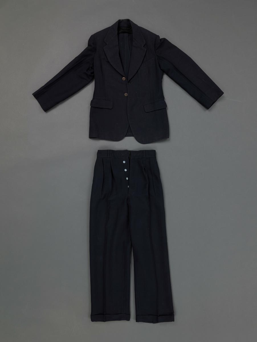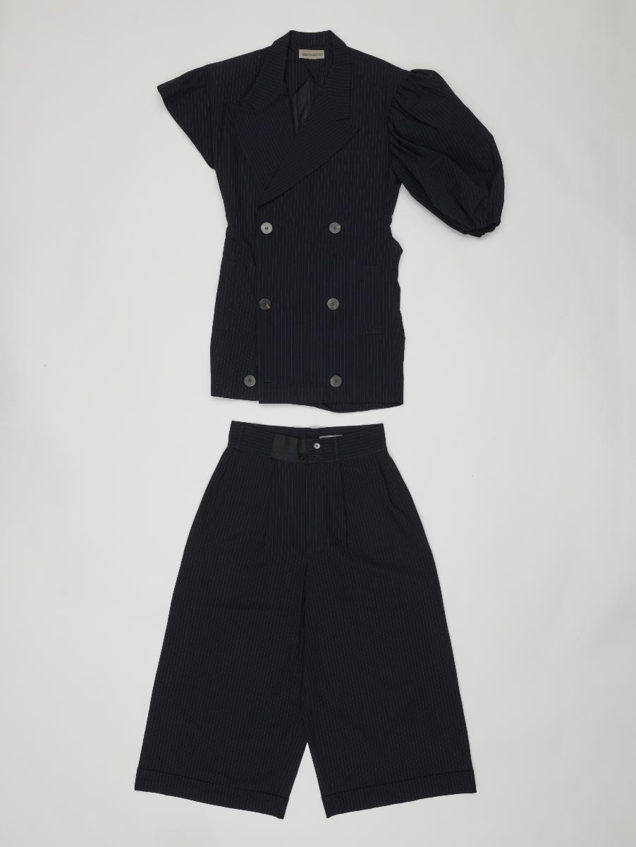 This black Matsuda suit with brocaded line patterns belonged to Judith Chung, a fashion entrepreneur and journalist. A white inner waistcoat with brocade graphic patterns is handsewn into the jacket. The ensemble’s textural techniques and unique finishing details reflect designer Mitsuhiro Matsuda’s innovative textile experimentation, which garments under his company Nicole Co. Ltd. were known for.Along with the rise of Japanese fashion globally in the 1980s, boutiques in Singapore catering to Japanese designers multiplied. Judith Chung was the owner of the popular boutique Man and His Woman (1972–1993), one of the most significant shops in Orchard Road that carried such Japanese brands. The multi-label store also brought in the most desirable global high fashion labels in the 1970s–80s. Her tastes and shop shaped an entire generation of fashionable people in Singapore and the region.