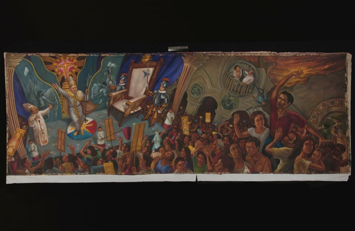 The God of Small Things, which draws its title referencing the eponymous book by Arundhati Roy with the same name, is a presentation of paintings that Kurniawan has been working on throughout the past couple of years. Although Kurniawan often works on a much larger scale in his works, he found in exploring these new paintings a more intimate, simple attitude of contemplation and expression. The paintings contain many different colours and seem illustrative or even comic-like at first glance, which belies the complexities of what Kurniawan is sharing through his works. The paintings begin as drawings on paper that act as studies, of sorts, for Kurniawan to begin developing the compositional framework for his other works. Kurniawan is a storyteller, using the medium of painting to communicate things that may not be so easily expressed in other ways. Like manuscripts of his mind, each painting acts like a vignette or the representation of a certain scene within a larger narrative, and they are meant to be understood in this way, that a multifaceted story begins to emerge when considering the works not only in isolation from each other but rather in relationship to each other. Moving from one scene, or stage, to the other, there seems to be a sense of detachment, but simultaneously a building up towards a discrete premonition regarding the bigger picture of what Kurniawan is sharing through the presentation as a whole. The symbolism in Kurniawan’s paintings is enigmatic in nature and is not meant to be tied down to a singular form of understanding or meaning. But Kurniawan leaves clues and suggestions for the viewer to speculate and imagine their own readings. Each of the paintings in The God of Small Things is framed inside or within the vicinity of private dwellings, and the characters he builds in his works seem to be conducting themselves within the assumption that they are not being observed. Kurniawan generates stark tension between these private spaces with intrusions of broadcasting devices, electric cables, and radios. Many of the characters are wearing face coverings, masks, or helmets and therefore seem to be protecting themselves from an invisible threat that may appear at any moment, even at home.