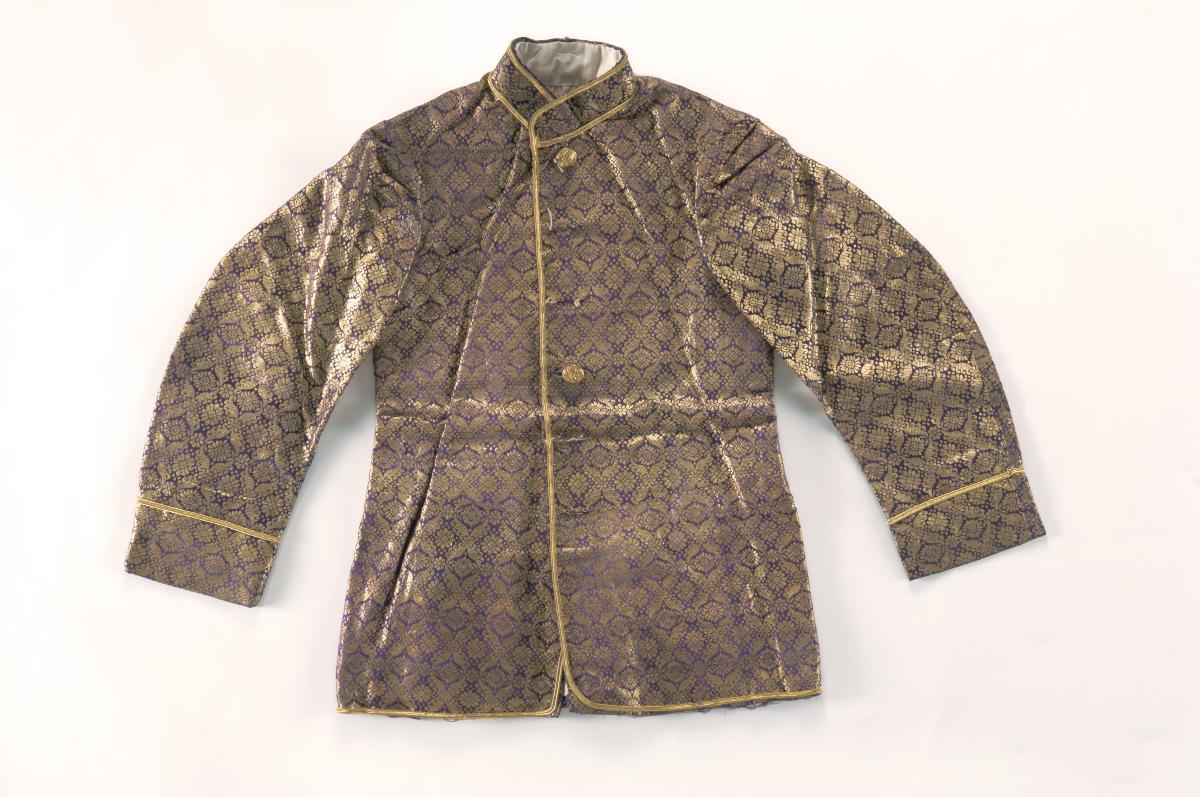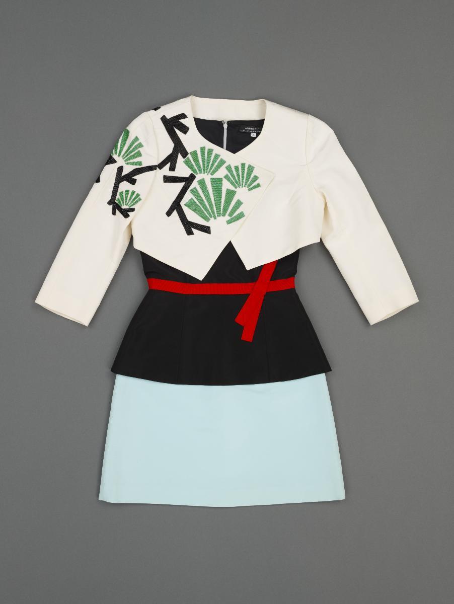 This black sleeveless mini dress is matched with a jacket featuring dramatic ‘pagoda’ shoulders, white pleated cuffs, and crystal buttons. The ensemble comes from Andrew Gn’s ‘Hope and Glory’ collection which was presented as a film during the Covid-19 lockdown. It was worn by lead actress Lily Collins in the Netflix series ‘Emily in Paris’ in 2022. Andrew Gn is one of Singapore’s most prolific fashion designers in history, achieving high levels of critical acclaim and industry success. He is the only Singaporean to be a constant feature of Paris Fashion Week since 1995. His creations are known for their elegant, feminine, maximalist aesthetics and are finely crafted, cross-cultural, and reflective of innovation in tradition in fashion. This work is part of his major gift back to Singapore.