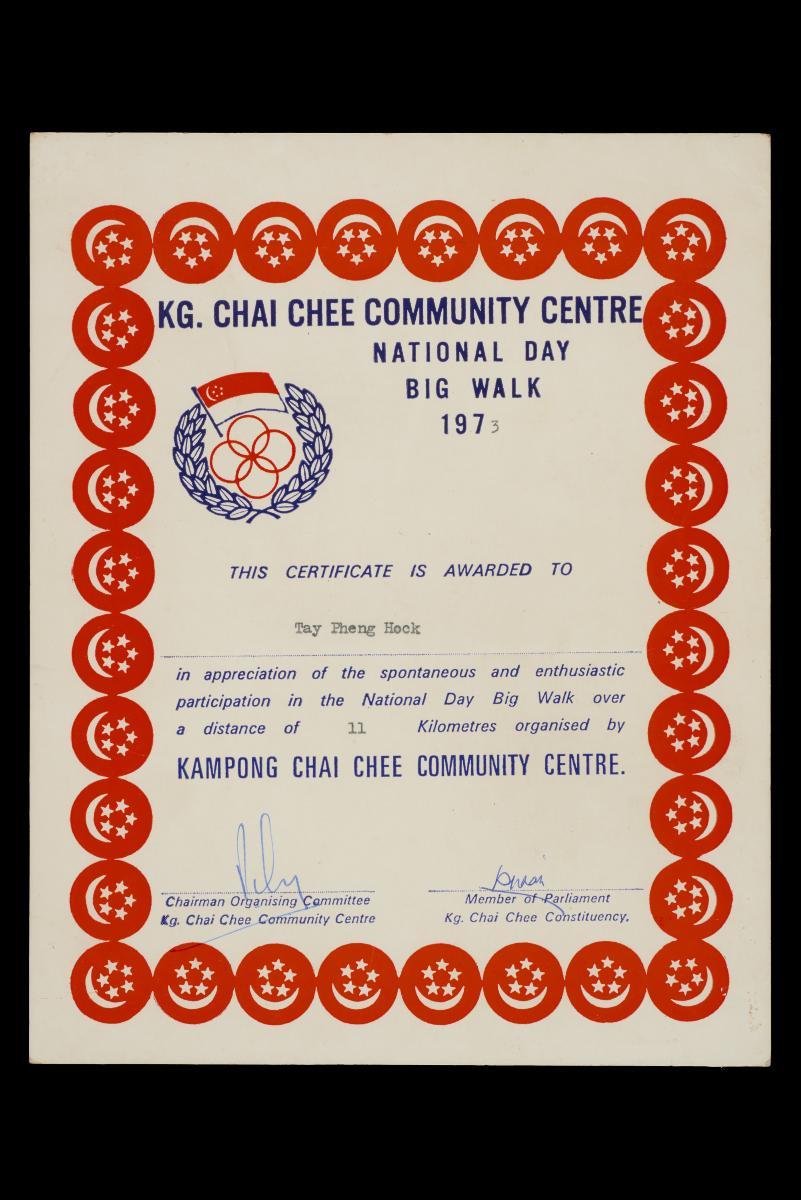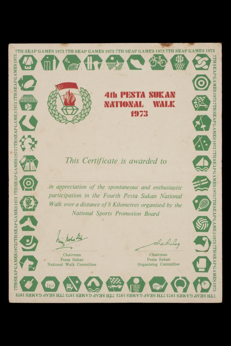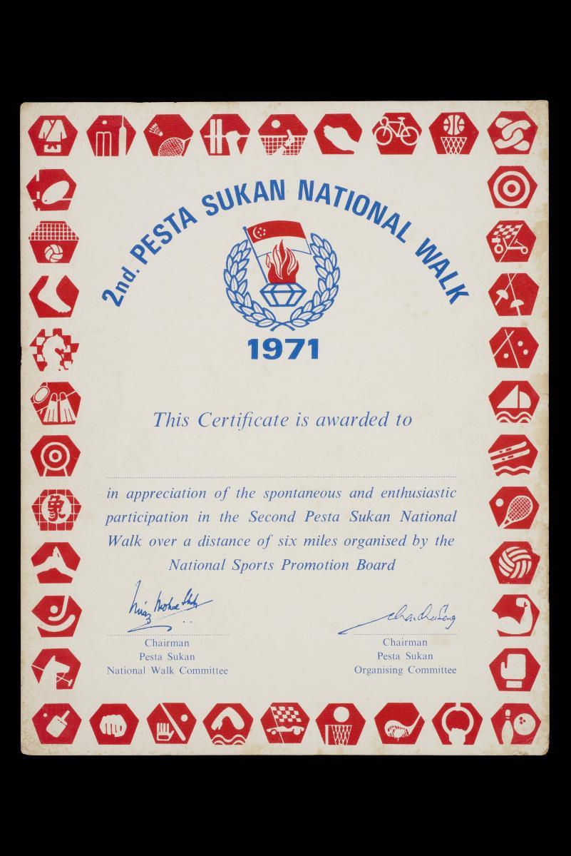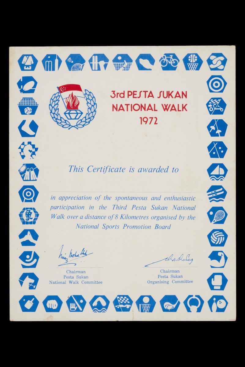 This certificate was given to participants in the 1st Pesta Sukan National Jog, 1975. More than 15,000 joggers took part. The recipient, a student at the time, received the certificate from his school without his name filled up in the blank space.
