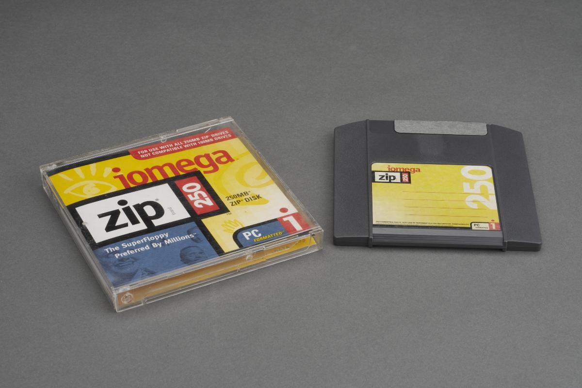 This is a Zip disk with 100 MB storage capacity. Zip disks were a disk storage medium produced from 1995 by Iomega. A Zip drive was needed to read the disks. The disks were available in 100, 250 and 750 MB storage sizes, which were large for the time. They also had a larger capacity than the 3.5-inch floppy disk, which typically could store 1.44 MB of data. They were used during the late 1990s to early 2000s, before being replaced by other storage media like thumb drives. The donor used the Zip disk to store large project files when studying multimedia software engineering.