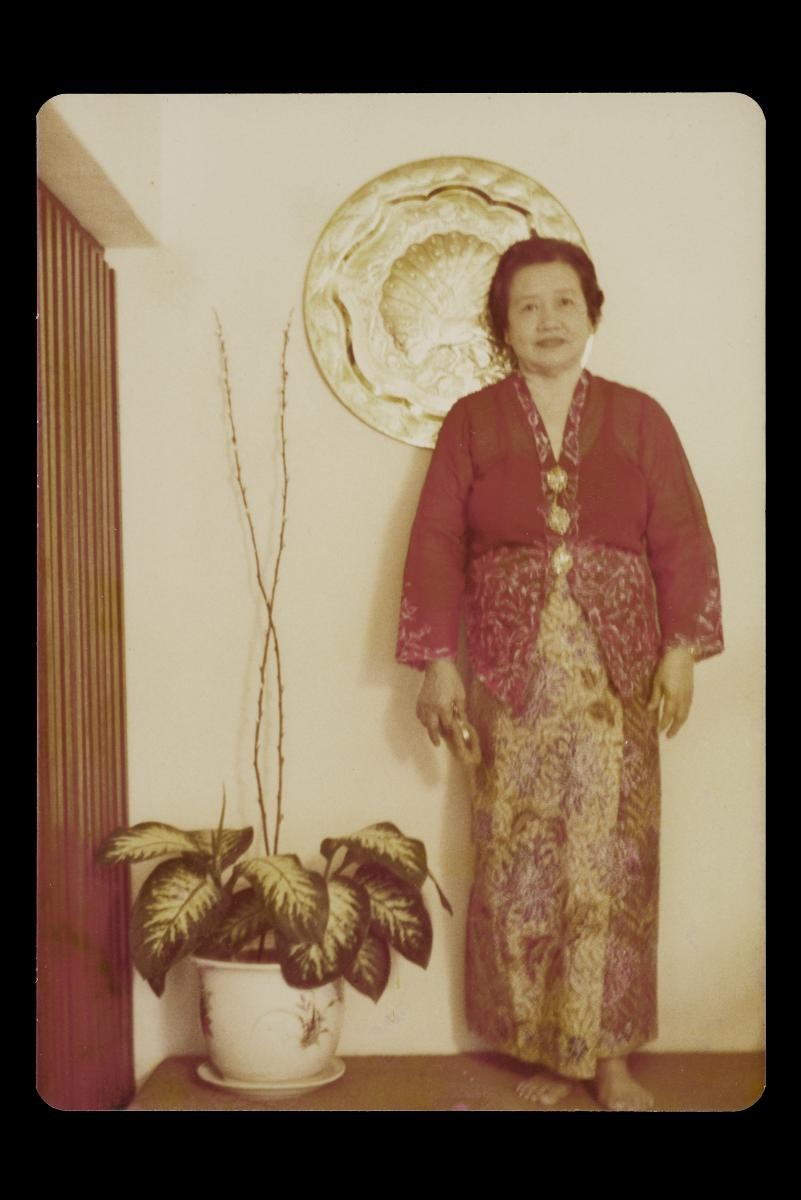 Known as kerosang rantay (kerosang or kerongsang being the Malay word for blouse fastener and rantay meaning chain), this jewel comprises three oval-shaped fasteners linked together with chains. Each fastener is set in gold and rose-cut diamonds (intan) in open (à jour) setting, which allows light to enter from the front and back of the brooch. Such fasteners are worn by women from indigenous, foreign, and mixed-race communities in Southeast Asia to secure the front of a baju panjang or kebaya. This kerosang rantay was worn by Nancy Peh Cheng Neo (1919 – 1994), a Peranakan nyonya who married John Wee Chim Hock. Nancy’s mother, Seet Guan Neo was from Malacca and married Peh Wah Kok of Singapore, who was awarded the M.B.E. on 7 June 1951. Peh Wah Kok’s parents were Mr Peh Kiat Lam (1857 – 11 November 1930) and Mrs Peh Kiat Lam née Wee Huat Neo (1859 – 21 October 1927). Up till the late 1970s, four generations of the family including Nancy Peh Cheng Neo's children lived at “Rose Villa” in Geylang, Singapore.