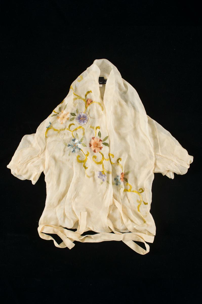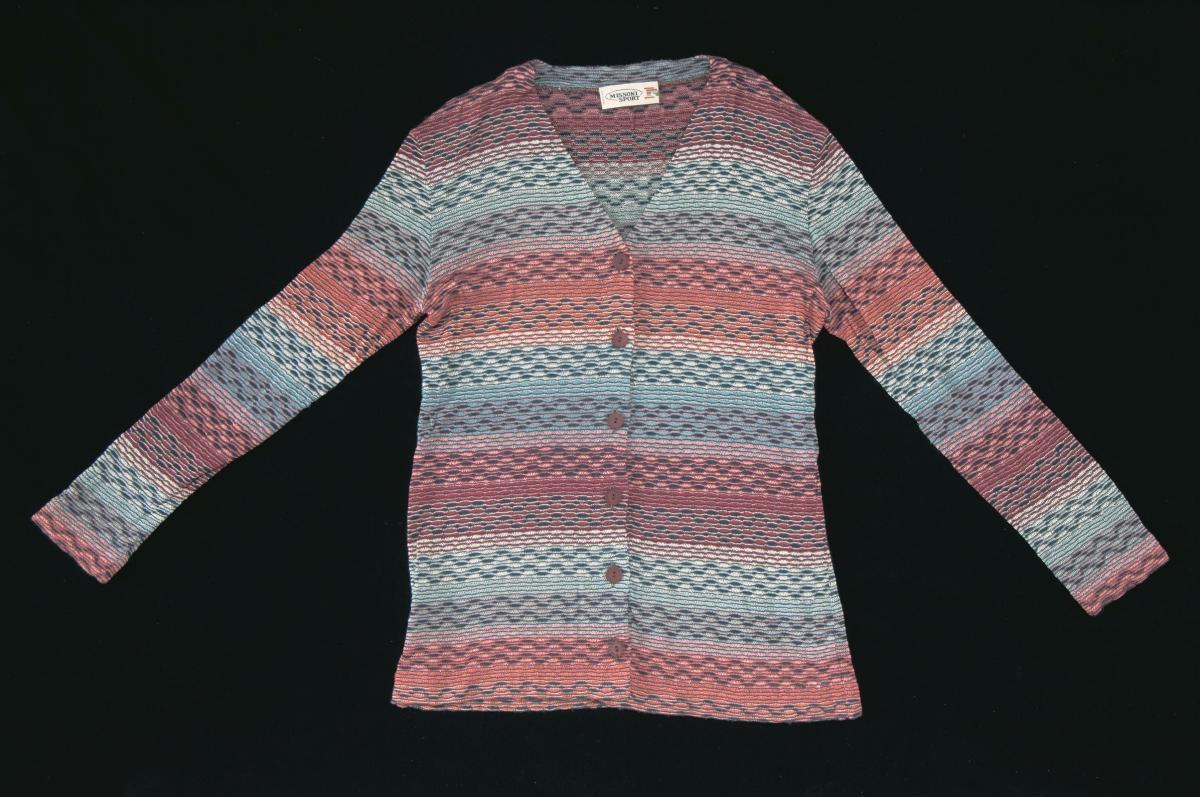 Bobby Chng is a Singaporean designer who transitioned from graphic design in advertising to a fashion designer. He was known as one of the “Magnificent Seven” in Singapore's fashion design circle, which consisted of himself, Kelvin Choo, Peter Kor, Esther Tay, Thomas Wee, Tan Yoong and Celia Loe. He sold his clothes largely in department store such as Isetan, Metro and Tangs. He was best known for his ready-to-wear and menswear collections. This cardigan was bought in Tangs in the late 1980s. The donor, Tia Boon Sim, was attracted to it because of the embroidered detail on its front and sleeves.