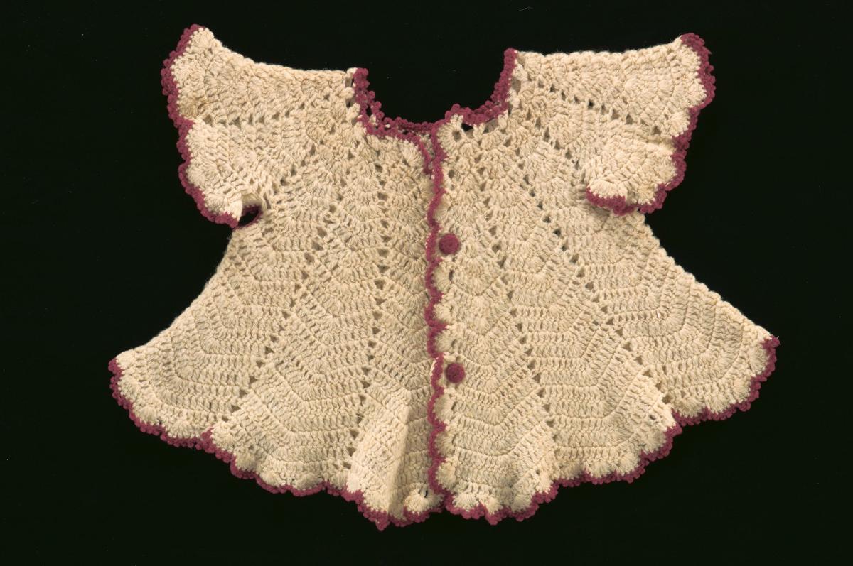 This is a woolen baby coat worn to keep children warm. It was worn by the donor's mother, Koh Ai Ai, as a baby in the 1930s.