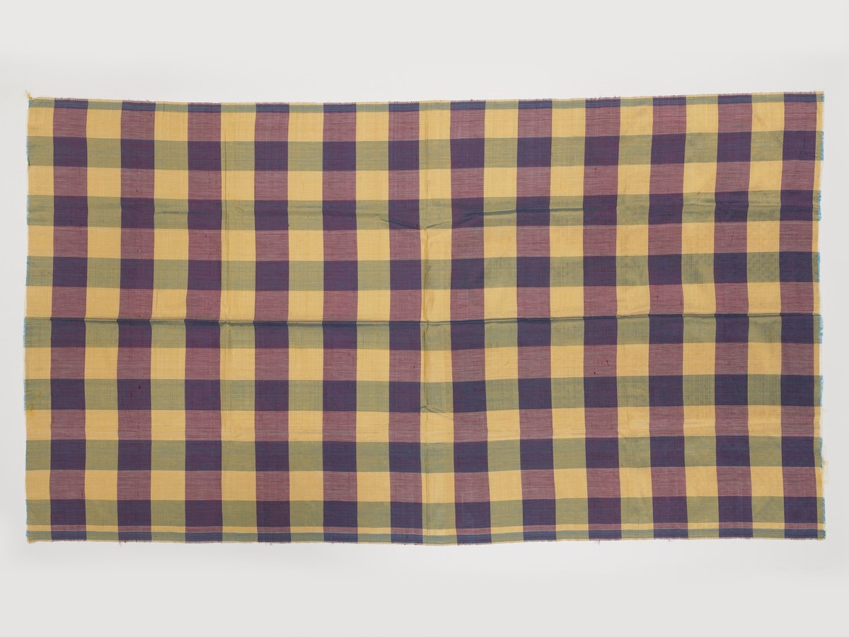 This kain tenun, a traditional textile cherished in the Malay Archipelago since the 15th century, woven with purple and red cotton thread, features a unique panel adorned with jalur and stylised blossom motifs in gold thread. This panel is positioned at the centre of the wearer's waist and serves as a decorative focal point. It is traditionally secured around the hip or waist by tying it into a knot or wrapping it multiple times. Due to the stylised blossom motifs and the gold thread, this textile would have been primarily reserved for festive and formal occasions.