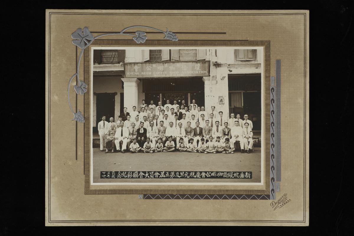 This is a group photograph of Kheng Keow Coffee Shop Association (新加坡琼侨咖啡公会) 's committee and members taken at their first headquarters on 6 Seah Street on January 1, 1937, to mark the first major expansion of their organisation. Amongst those pictured in the first row are then President Huang Cai Yuan (黄才源, 5th L), Founding President Liang Ding Ren (梁定任, 3rd R), and Founding Secretary Wu Ke Ren (吴可任, 1st L). Comprising a predominantly Hainanese membership, the Kheng Keow Coffee Merchants Restaurant and Bar-Owners Association (to which Kheng Keow Coffee Association was renamed in 1952) is one of two coffeeshop trade establishments in Singapore and Malaysia, the other being the Foo Chow Coffee Restaurant and Bar Merchants Association (福州咖啡酒餐商公会). Kheng Keow provided leadership, mediation and counsel for members on numerous pertinent issues including the modernising of the coffeeshop industry, coping with inflation and rental hikes, as well as keeping abreast with automation and technology in the twentieth century. The item also bears the official stamp of the organization and a handwritten memo indicating that it is a gift bequeathed to then President Huang Cai Yuan (黄才源).