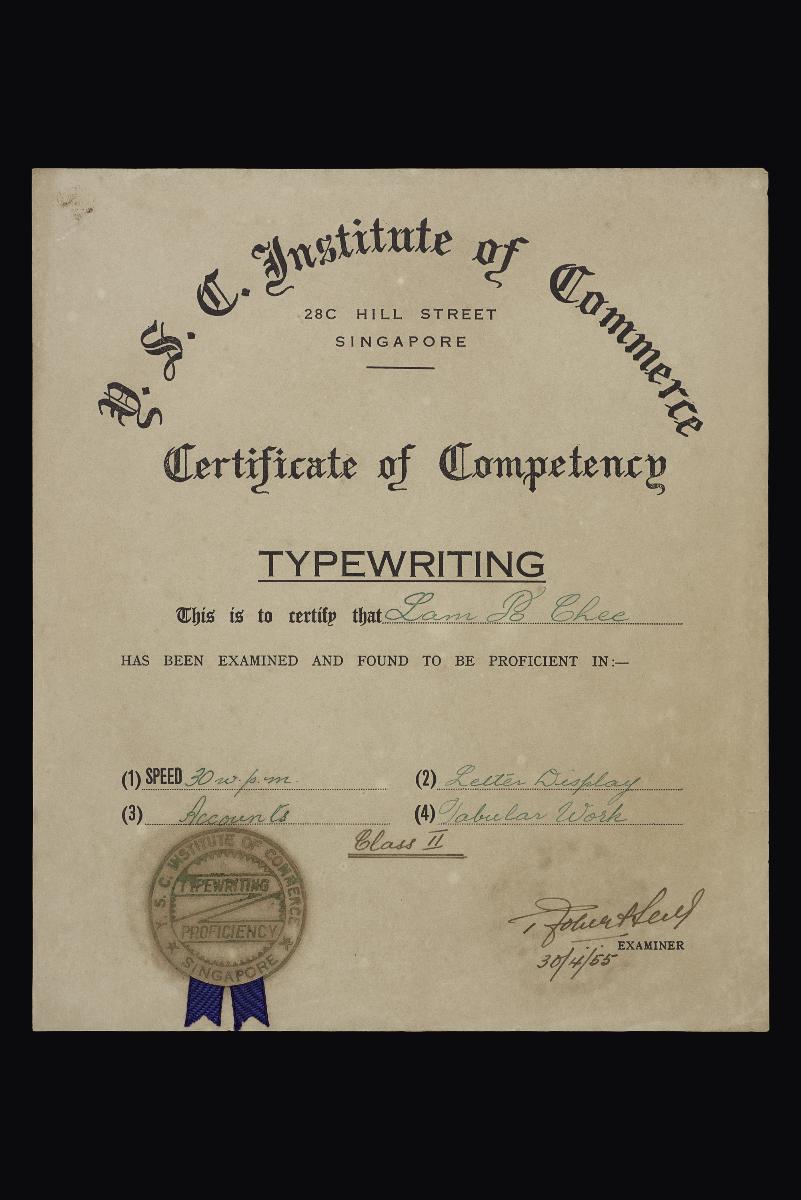 This certificate of competency was issued to Mr Anthony Woo in 1965. It certified that the recipient was qualified to fulfil the duties of Second Class Engineer on board a steamship.