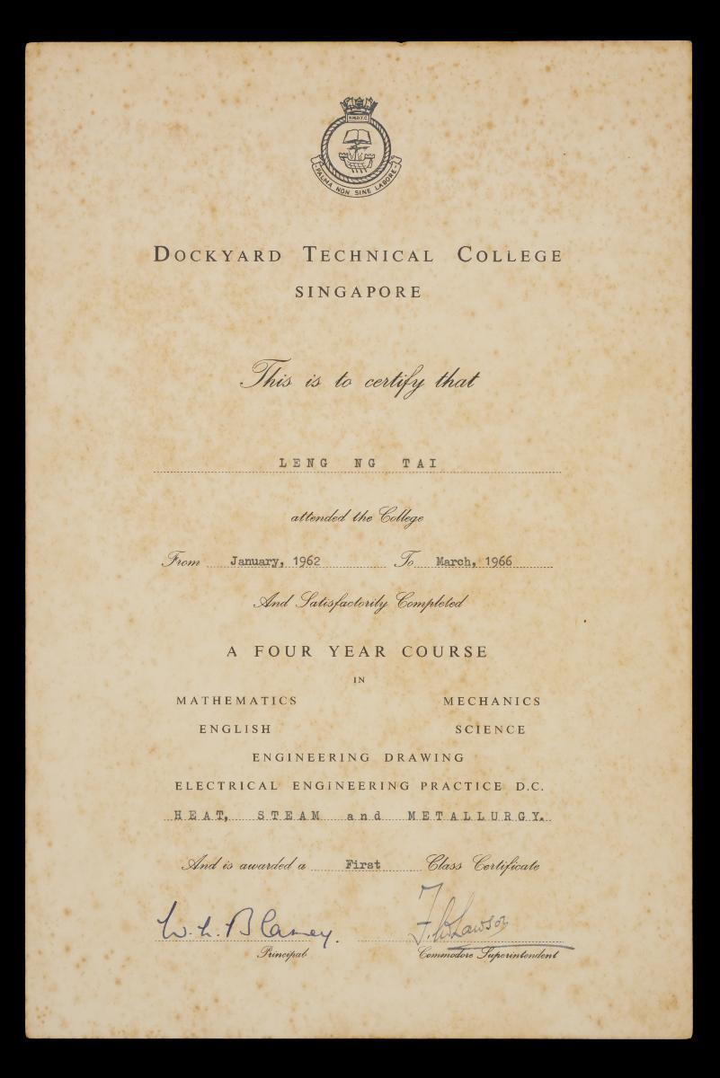 These payslips record the weekly pay to an apprentice at the Dockyard Technical College from 1957 to 1962, starting at $24.75 per week with an annual increment of $2.75. The College, a part of the British Naval Base at Sembawang, paid young men a small weekly wage to study and learn technical skills. At the end of their five-year apprenticeship, they were free to leave, if they chose, or remain employed at the British Naval Base.