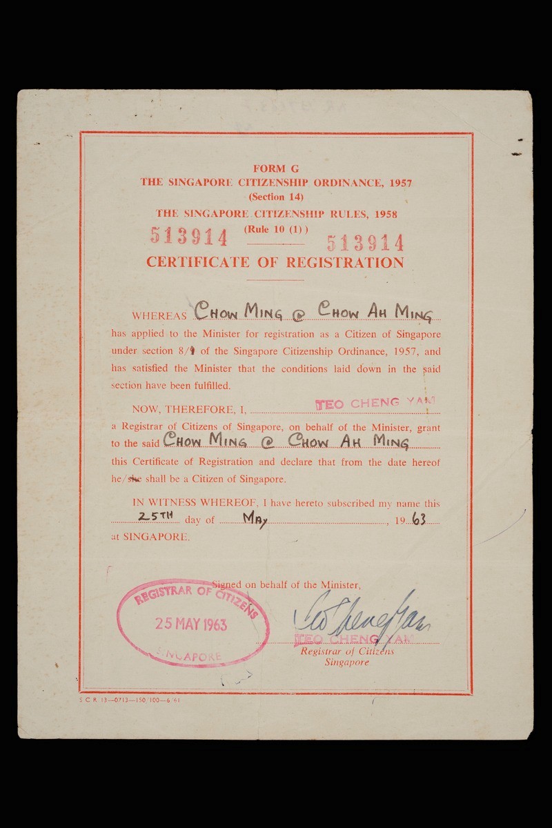 Chow Ah Ming came to Singapore from Ipoh, Malaya, in the 1950s and joined the Teachers’ Training College. At this time, he lived at the Kingsmead Hall student hostel for Malayan trainee teachers at Farrer Road run by the Society of Jesus (Jesuits). He completed a 3-year training course at the College and qualified as a primary school teacher. He later went on to specialise in teaching English as a second language. While working as a teacher, he was appointed as a supervisor for the 1957 Census of Population of Singapore, as indicated in this certificate of service issued by the then Department of Statistics.