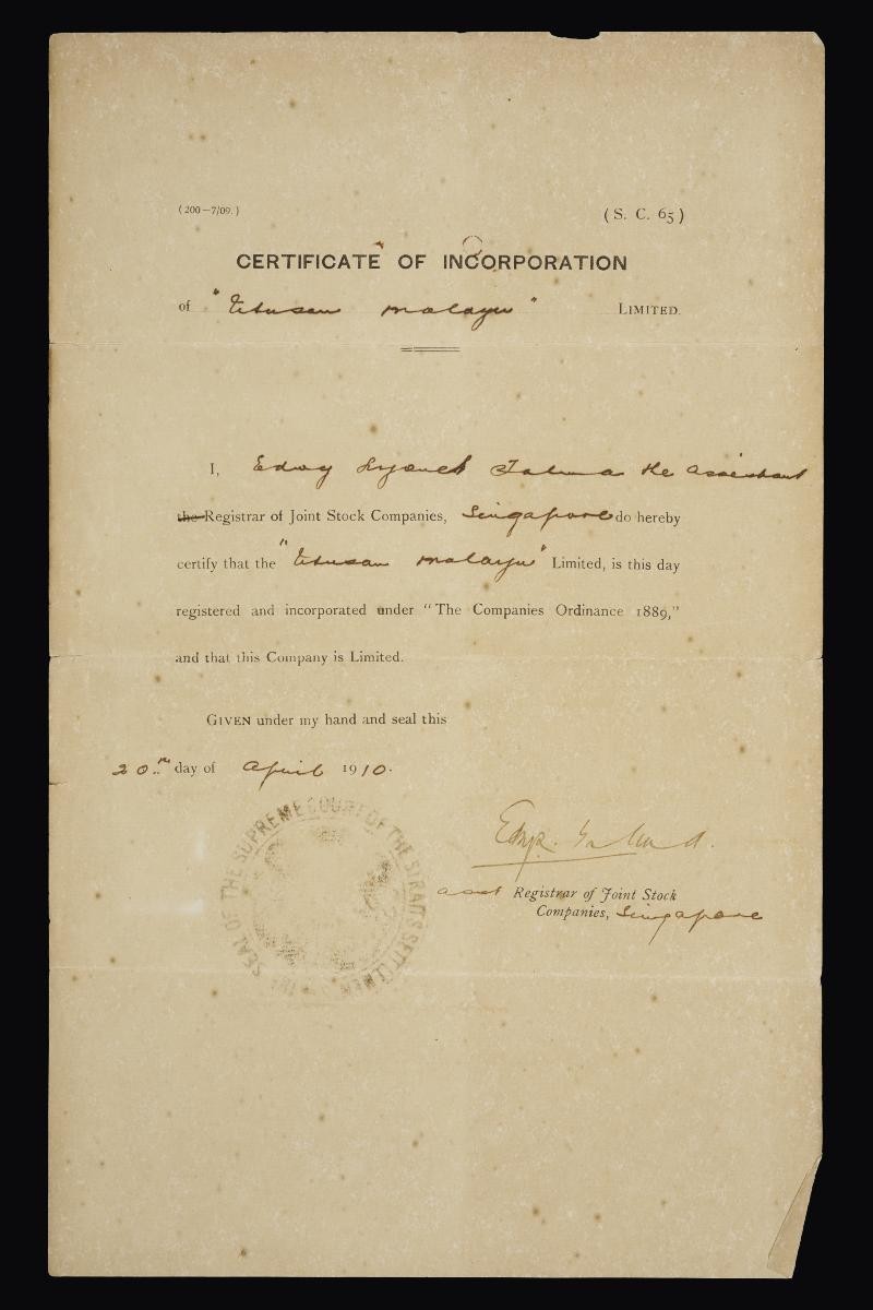 This memorandum of association of the Utusan Malayu was signed between its six key shareholders in April 1910. Utusan Malayu (not to be confused with the other Malay-language newspaper, Utusan Melayu) was an offshoot of the Singapore Free Press launched in 1907 with the intention to reach out to Malay-speaking audience in Singapore. Initially circulating thrice a week, Utusan Malayu became a daily from the years 1915 to 1921. Interestingly, the periodical carried news in both Jawi and romanized Malay scripts - the former to be accessible by Malay readers, and the latter for Straits Chinese readers. Eunos Abdullah acted as the paper's editor in its first two years, and continued to work with the paper until his departure in 1914. The Utusan Malayu would become one of the earliest platforms for commentaries and opinion pieces on the concept of the bangsa or nation in Singapore and Malaya.