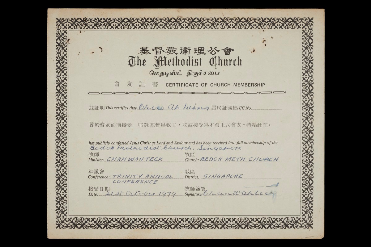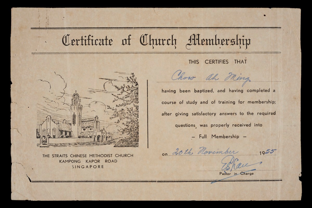 Chow Ah Ming came to Singapore from Ipoh, Malaysia, in the 1950s and joined the Teachers’ Training College. At this time, he lived at the Kingsmead Hall student hostel for Malayan trainee teachers at Farrer Road run by the Society of Jesus (Jesuits). Chow’s Christian faith was an important part of his life and he attended the Straits Chinese Methodist Church at Kampong Kapor Road. Subsequently, when Chow and his family moved from Queenstown to Limau Estate in Bedok, he and his wife began attending the nearby Bedok Methodist Church, which this publication is from. The Bedok Methodist Church community became a great support to Chow, especially in his later years. Chow was a member of the Bedok South Bible Study group, the Methodist Adult Fellowship and the Church Care Group. He also participated in excursions for seniors organised by the church. As he grew older, the members of the church would visit Chow at his home to check in on him and provide social support.