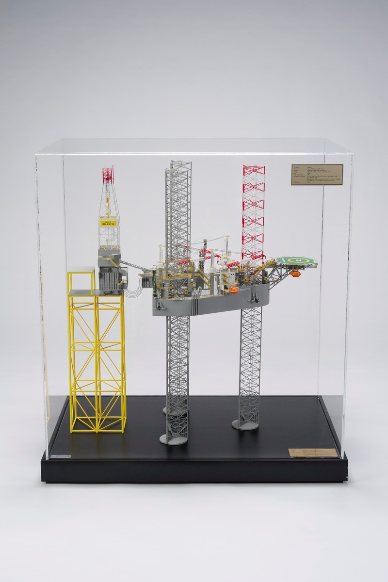 This is a model of PetroRig I, a semi-submersible oil rig constructed in 2009 by the government-invested Sembcorp Marine, using Jurong Shipyard's proprietary technique for fast-track construction. Commencing operations in 1964, Jurong Shipyard was Singapore's first commercial facility responsible for the repair, construction and outfitting of ships for international trade, and enabled the country to establish itself as a major player in the shipping and shipbuilding industry. Later, the shipyard and Sembawang Shipyard became part of Sembcorp Marine, and expanded into rig building and offshore engineering in the 2000s with the aid of the Economic Development Board (EDB). In response to falling oil prices and the global shift towards more sustainable sources of energy, Sembcorp Marine merged with Keppel Offshore & Marine in 2023 to establish Seatrium, with a strategic focus on diversifying away from the oil and gas industry.