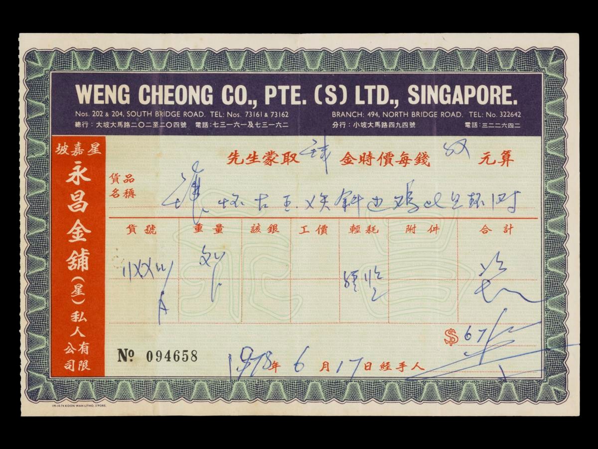 This is a receipt from Wen Cheong. Established in 1919, Wen Cheong is opened by Peng Bai Wei, who was one of the founders of Singapore Gold and Silver Merchants Association (now known as Singapore Jewellers Association). The receipt contains a seal that indicates “all forms of jewelries and gold ornaments purchased will be refundable calculated at market price less ten percent and minus the cost of the workmanship as shown on the receipt”. This showcases the role of the association in standardizing the price charged for the refund of gold ornaments sold by member jewellers.