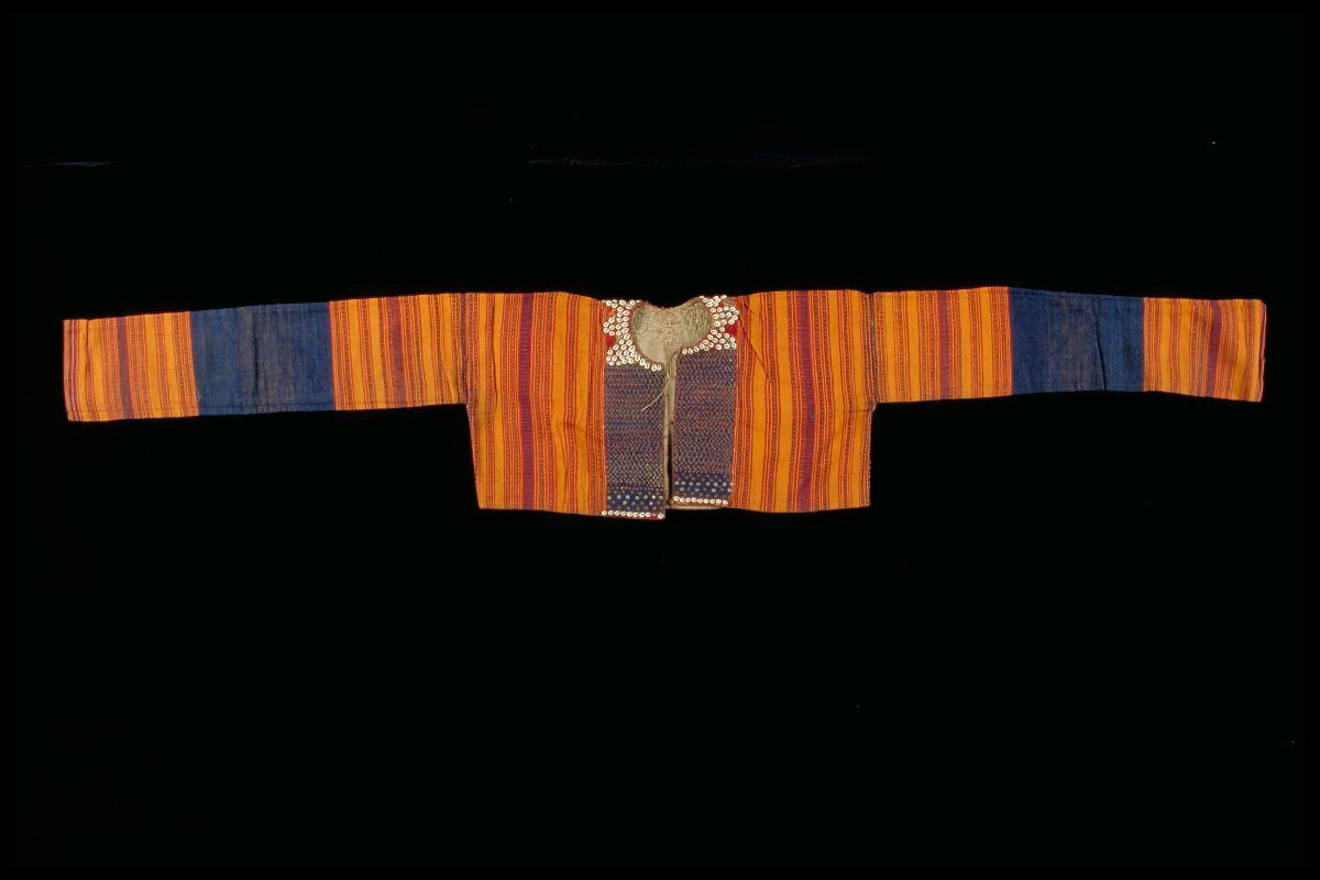 This ceremonial long-sleeved jacket would have been worn by young unmarried women in the Kauer district of the western highlands of south Sumatra. The decorative panels at the front and back of the jacket are embellished with appliqué of shells and tiny mirrors, and they feature geometric motifs weaved in supplementary weft.