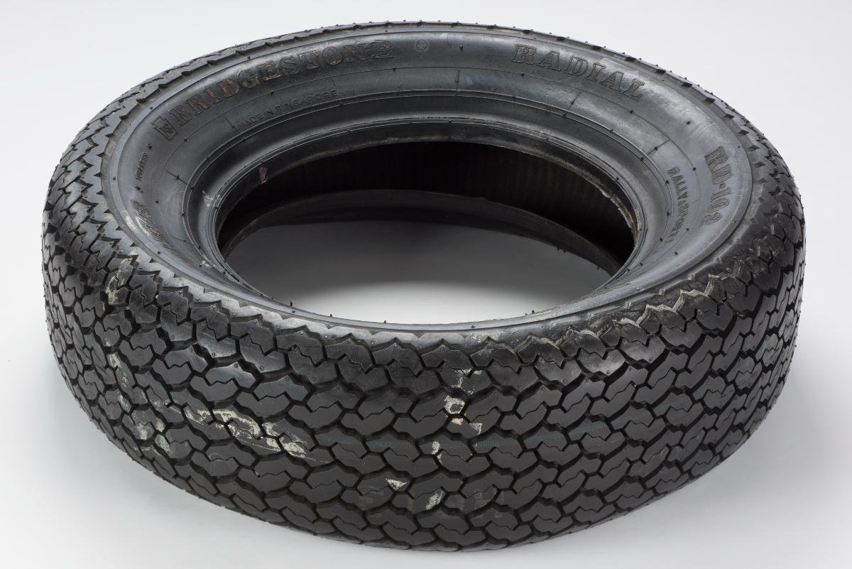 Bridgestone opened its first post-war overseas plant in Singapore in April 1965. Manufactured in Singapore, this Bridgestone tyre (BS 1 – RD 102) was used in the 1970s for rally sports in Singapore. This tyre was an original equipped tyre for the Toyota Corolla TE27 (Trueno).