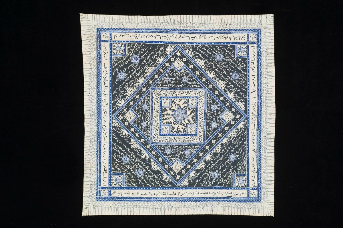 This elaborate cotton head cloth is part of a set of garments comprising a jacket and trousers worn by the women of Lolo, a highland community in North Vietnam, known as Flower Lolo (Rong Me). The black head cloth is folded and wrapped around the head like a wide headband. It is tie-dyed with floral and geometric motifs, embroidered and appliquéd with bright fabrics. The beaded tassels are decorated with plastic buttons, glass and bone beads and colourful pompoms. The Lolo are Tibeto-Burman language speakers who live in settled villages, farm wet rice and raise cattle. Ancestor worship is predominant and ancient head-hunting rites are still observed at funerals.